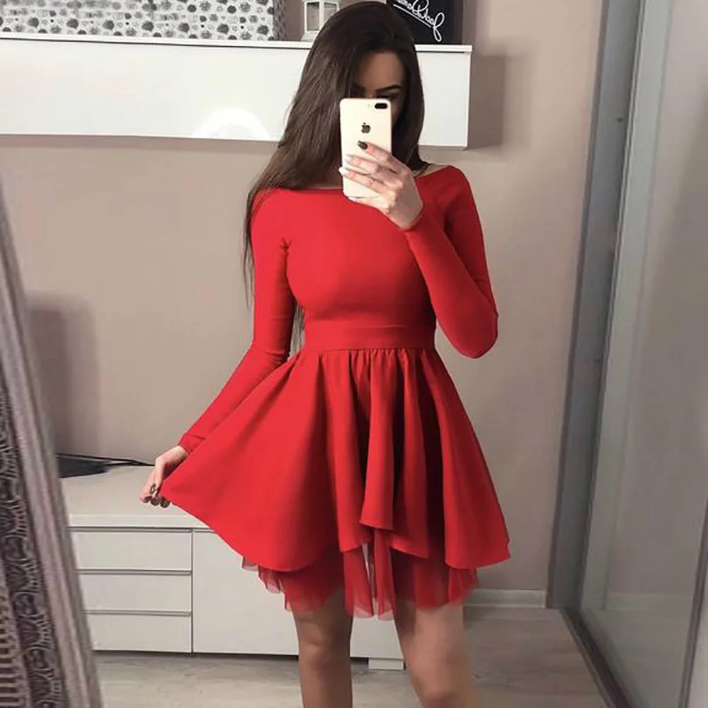 Женское атласное платье с длинным рукавом, красное, ТРАПЕЦИЕВИДНОЕ, для выпускного вечера