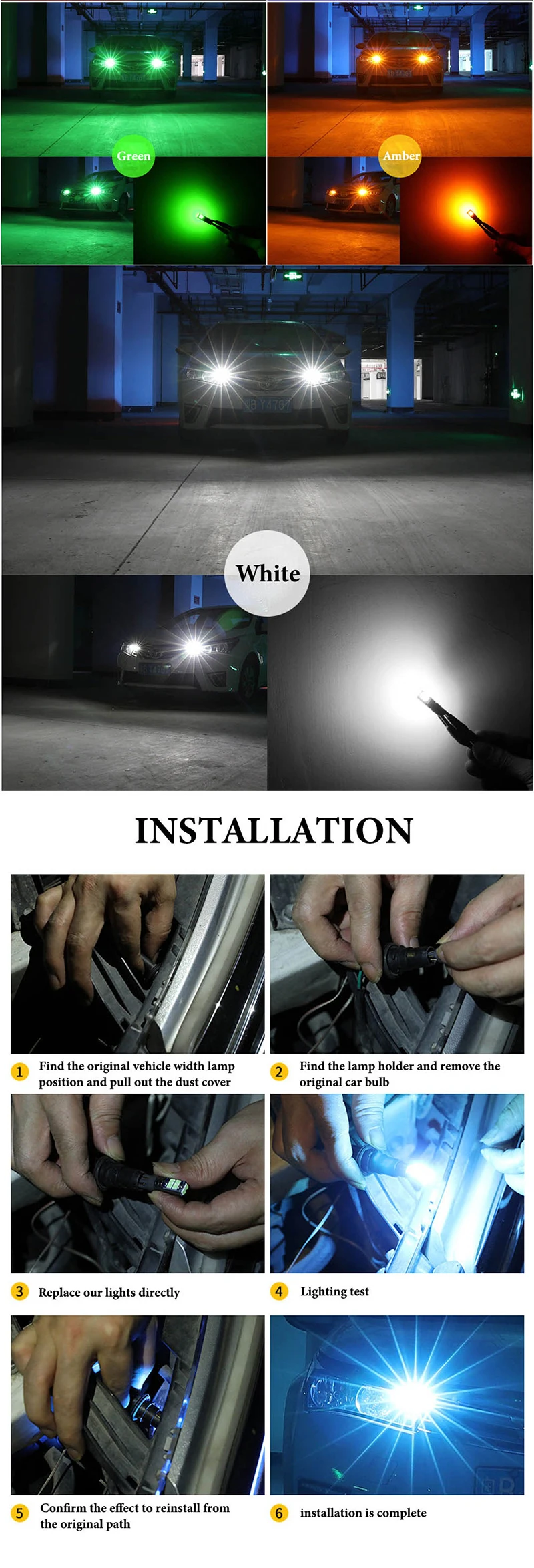 Совместимость:Вы можете использовать их практически в любом месте на вашем автомобиле или мотоцикле. Общие места: Parkers/DRL/City Lights, Map Lights, Boot/Trunk Lights, Number Plate and License Plate Lights, Side Indicator Lights, Gauge и Dashboard lights