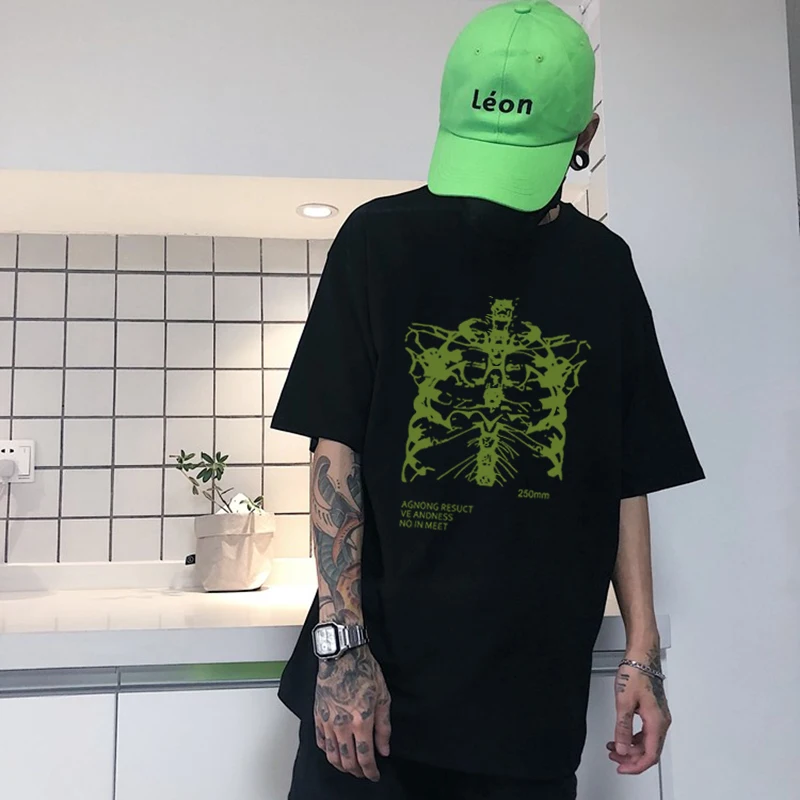 Крутая летняя уличная футболка в стиле хип-хоп с коротким рукавом, винтажная одежда большого размера с принтом скелета, футболка для мужчин и женщин, топы унисекс в стиле панк