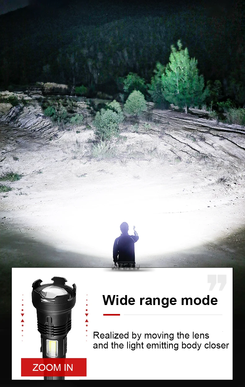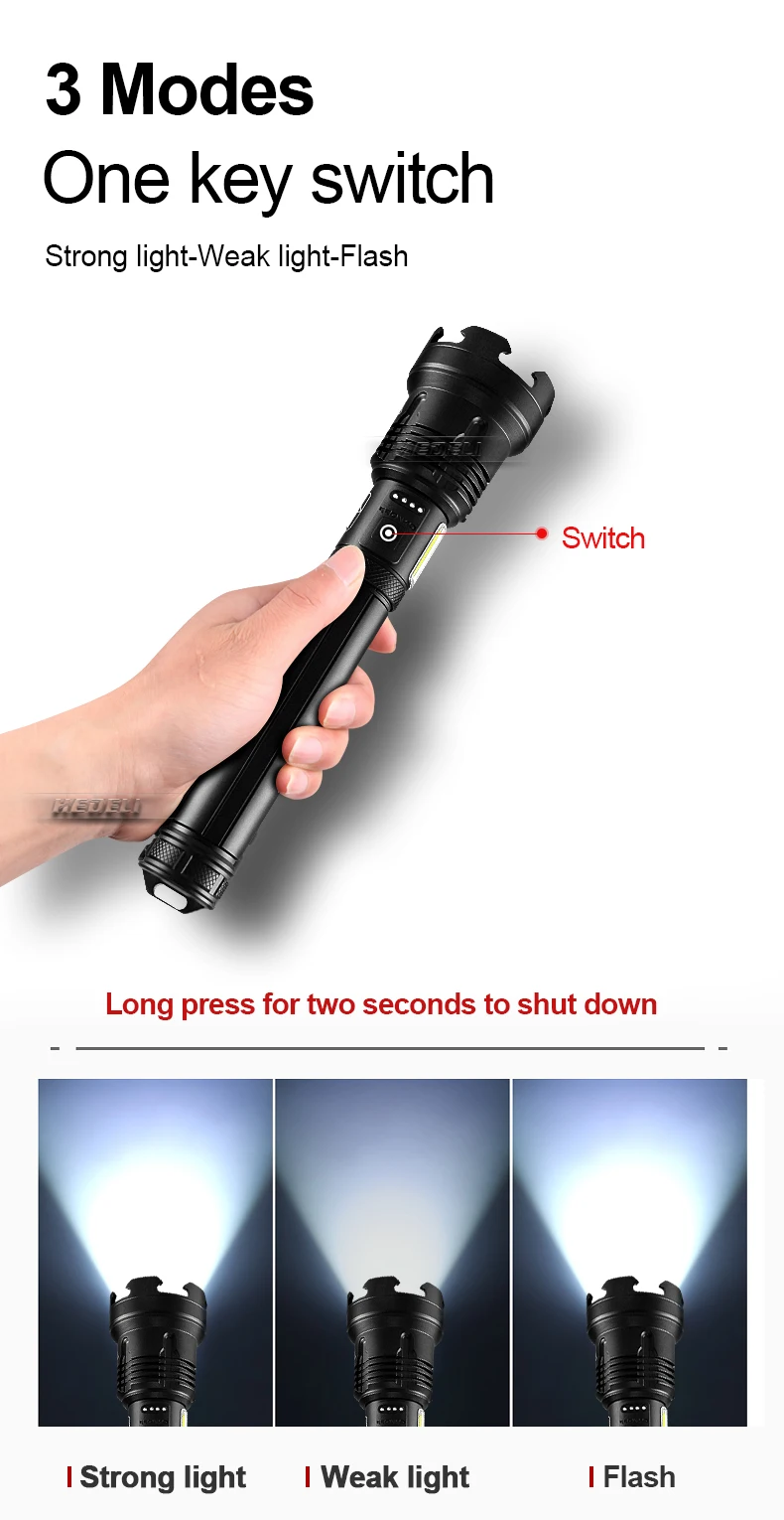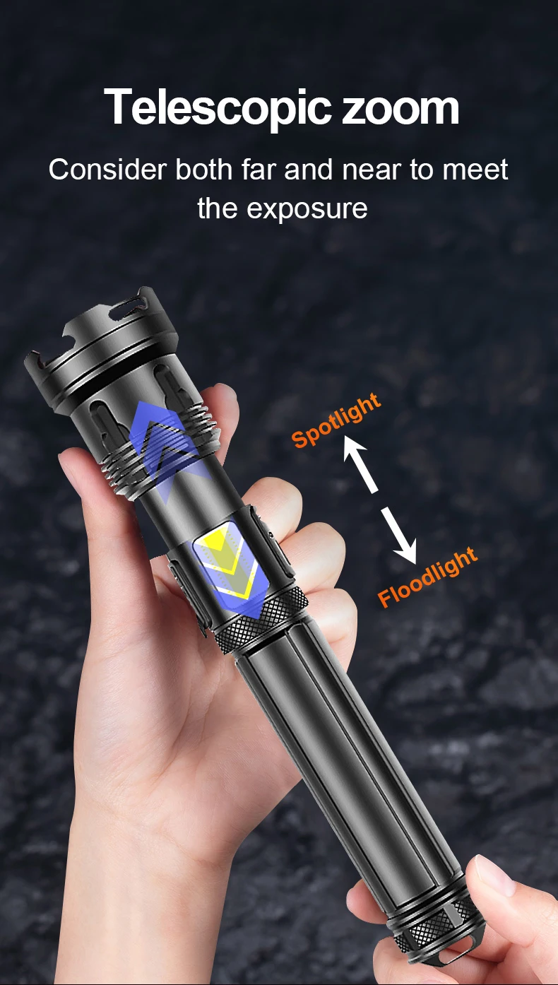 • Самый мощный тактический фонарик с использованием самого мощного светодиодного фитиля XHP199• 7 режимов, COB светильник (светильник и светильник) сбоку• 4-уровневый дисплей батареи (100%-75%-50%-25%), Предупреждение о низком заряде батареи.• Используйте аккумуляторные батареи 18650 или 26650, внутренняя проводка использует высокоэффективную схему повышения мощности для максимального использования аккумуляторов.• Класс водонепроницаемости соответствует IPX-6, водонепроницаемость, можно использовать в дождливые дни, но нельзя класть в воду• Фонарик можно использовать в качестве мобильного источника питания. Это незаменимый продукт для кемпинга и путешествий.• С ударопрочностью 2 метра, он подходит для охоты, кемпинга, работы, учебы, предупреждения, поиска и спасения, альпинизма и т. Д.
