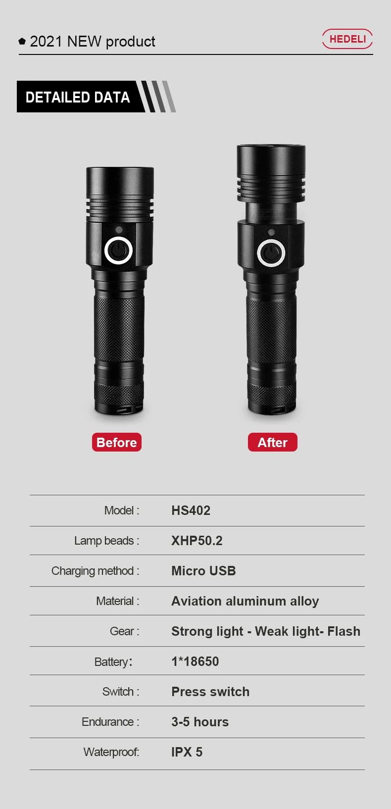♦Бренд: HEDELI♦Лампы: CREE XHP50.2♦Диапазон: 350-500 метров♦Режим масштабирования: телескопический зум♦Размер: 12,5 см * 3,5 см * 2,5 см♦Вес: 118 грамм♦Класс водонепроницаемости: IPX-6♦Режим питания: 1 батарея 18650♦Время освещения: 3-6 часов♦Способ зарядки: интерфейс USB Micro♦Осветительное оборудование: высокий/средний/низкий/Стробоскоп♦Индикатор питания: Красный светильник-необходимо заряжать; Зеленый светильник-полностью заряжен