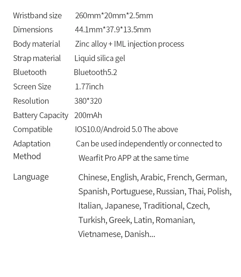 1. Модель: M26 Plus2. Размеры: 44*38,4*11 мм3. Материал корпуса: цинковый сплав4. Материал ремешка: силикон5. Экран: квадратный экран TFT6. Экран Размер: 1,77 дюймов7. Разрешение: 320*3808. Чип: HS66219. Датчик сердечного ритма: SC7R3010. Память: 128 м11. Bluetooth: 5,212. Емкость аккумулятора: 200 мАч13. Способ зарядки: Магнитная Зарядка14. Срок службы батареи: около 10 дней15. Время работы в режиме ожидания: 65 дней16. Режим касания: Полное касание17. Водонепроницаемость: IP6718. Приложение: WearFit pro19. Системные требования: Android 5,0 + / IOS 19. Системные требования: Android 5,0 + / IOS 10,0 +