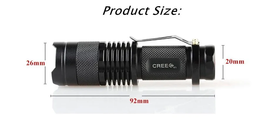 Супер Мини размер, яркий, ослепляющий эффект.Противоскользящий дизайн и водонепроницаемый дизайн.Выходная яркость может достигать 2000 люменов (макс.).Регулируемый диапазон фокусировки для различного использования, растягивается для регулировки фокуса.Зажим для удобной переноски.Рабочее напряжение широкое и может использовать батареи в самой большой степени.Подходит для охоты, велоспорта, альпинизма, кемпинга и активного отдыха и т. д.