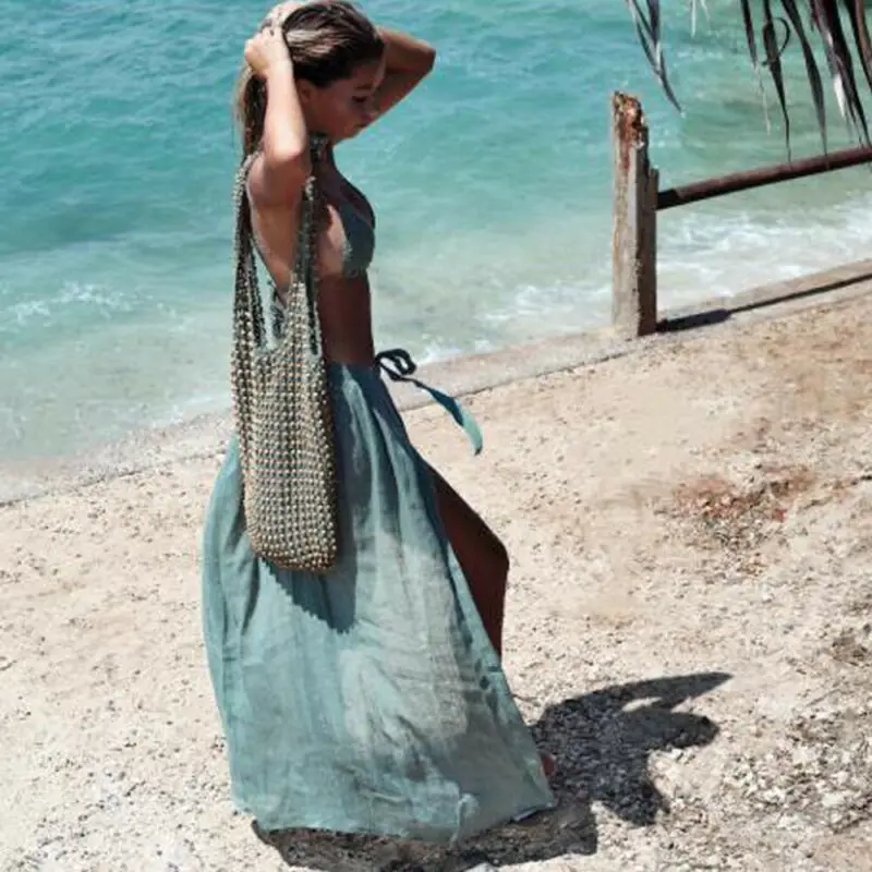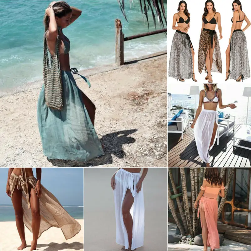2021 Сексуальная женская накидка на бикини, однотонная шифоновая одежда для плавания на шнуровке, длинная юбка, летние макси накидки на пляжное платье-саронг