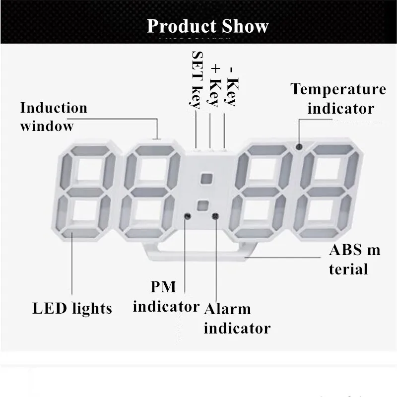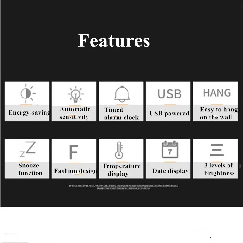 1. Отображение времени, даты, температуры2. Два режима отображения по Цельсию или Фаренгейту3. Функция повтора, время повтора по умолчанию составляет 5 минут4 .. Настройка будильника Поддержка настройки одного праздника/выходных/каждого дня будильник, звуковой эффект будильника: Тиковый звук, длится около 1 минуты, в течение которых Тиковый звук постепенно ускоряется5,4 уровней регулировки яркости (Автоматическая/Ручная регулировка), автоматический режим светочувствительности.Режим чувствительности: слегка нажмите кнопку +, чтобы настроить в соответствии с дисплеем на экране (L-AU L-01 L-02 L-03)Регулировка интенсивности света (метод переключения один кран), L-AU: Автоматическое затемнение, L-01: Первая передачаЯркость, L-02: второй уровень яркости, L-03: третий уровень яркости.6,12/24 часа в сутки система может быть включен7. Usb-порт для зарядки, без разъема, быстрая зарядка не допускается8. Функция отключения памяти9. Рабочий стол или Висячие двойного назначения (Съемное основание, одно отверстие, висящее на спине)10. Режим сна может быть установлен