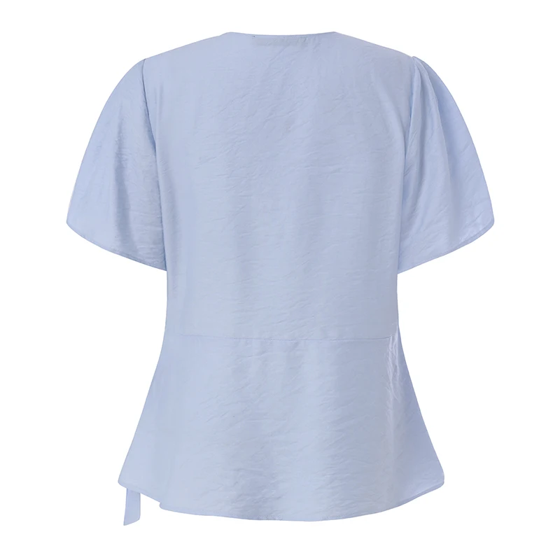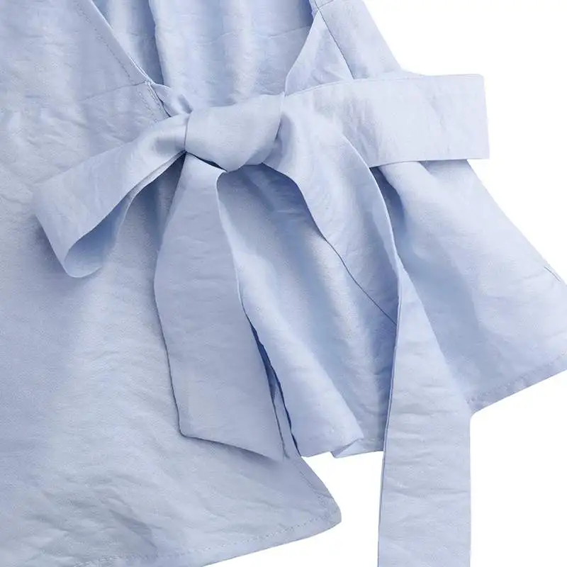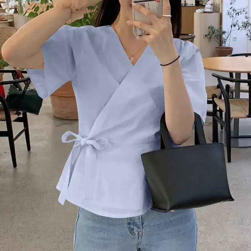 Женская блузка с поясом, летняя, однотонная, повседневная, с запахом и V-образным вырезом, 2021