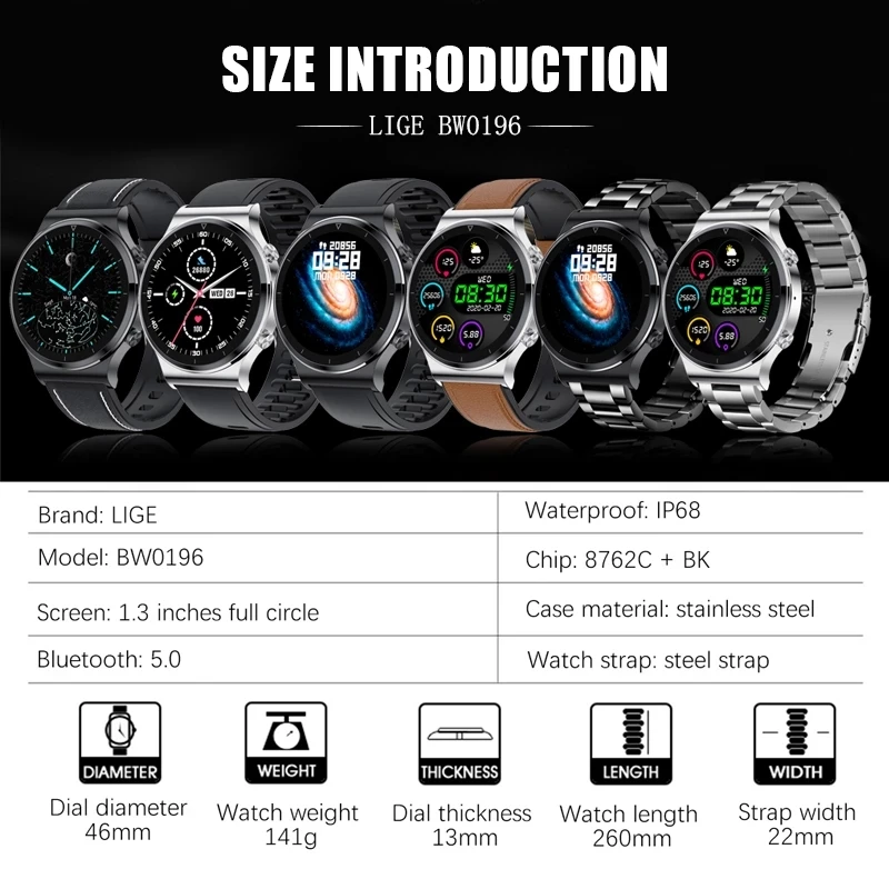 Длина наручных часов: около 26 смДиаметр циферблата наручных часов: около 4,4 смТолщина циферблата наручных часов: около 1 смШирина ремешка: около 2,2 смВес наручных часов: около 100 г/150 г