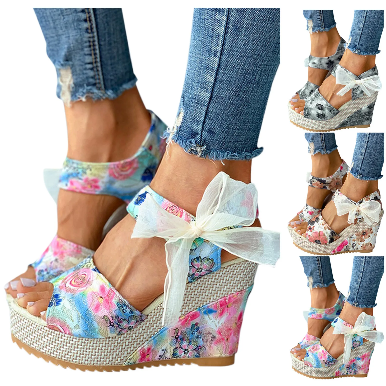 Женские босоножки на танкетке и платформе; Модная обувь на шнуровке с цветочным узором