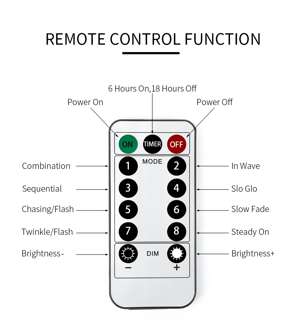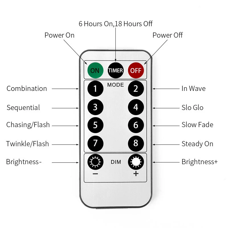 8 режимов: комбинация, волна, последовательно, Slo glo, чеканка/вспышка, медленное выцветание, мерцание/вспышка, устойчивый