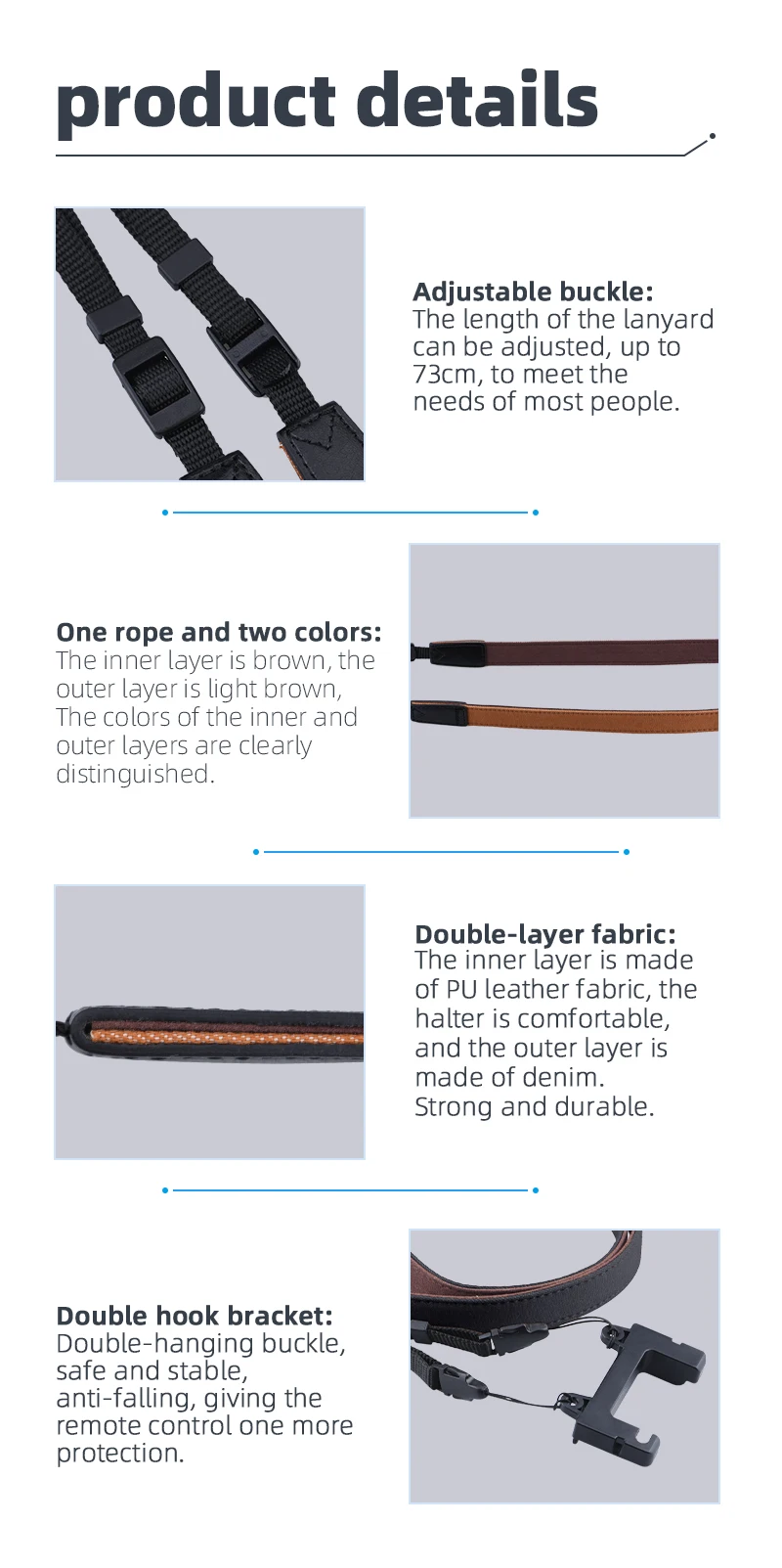 1. Освободите руки и облегчите воздушный полет,2. Ремешок доступен в двух цветах, и подвесная горловина удобна,3. Двойной Крюк кронштейн, прочный и анти-падение,4. Он используется для других пультов дистанционного управления с висящими отверстиями и имеет широкий спектр использования,5. Удобно носить, длинная длина может быть скорректирована до 73 см, а Регулируемая пряжка соответствует привычкам ношения разных людей.