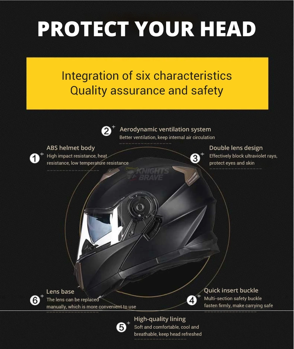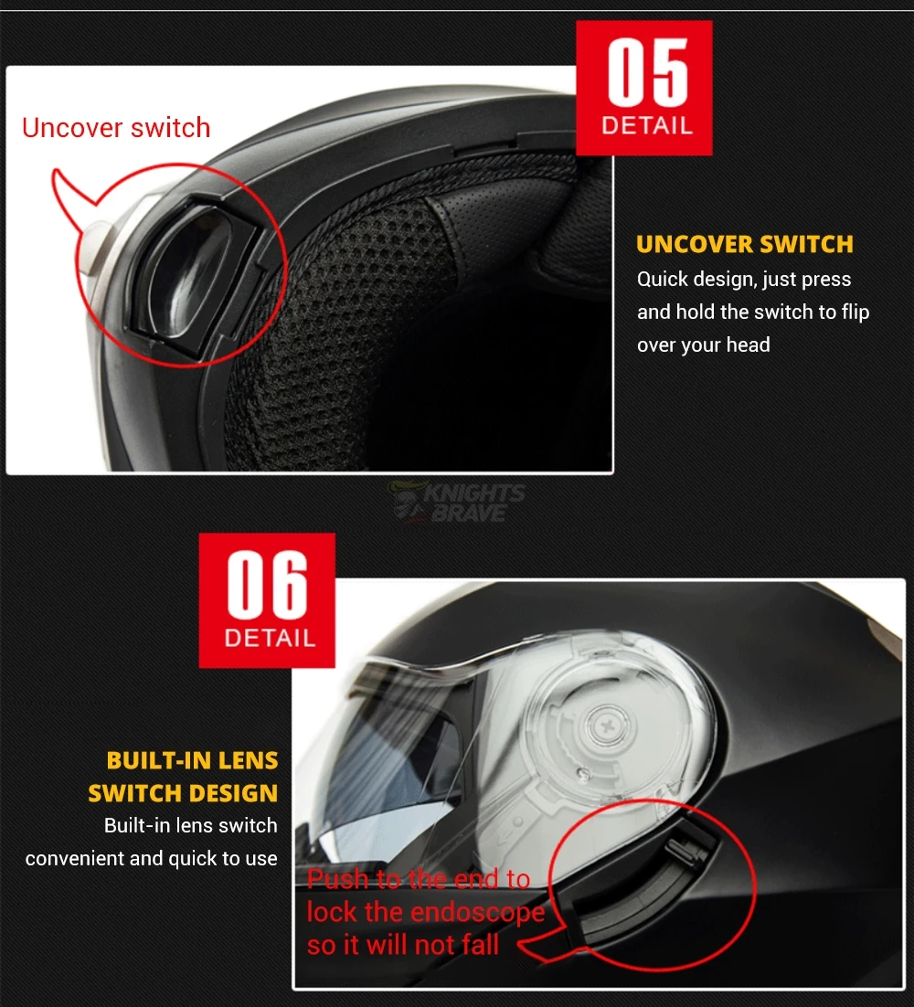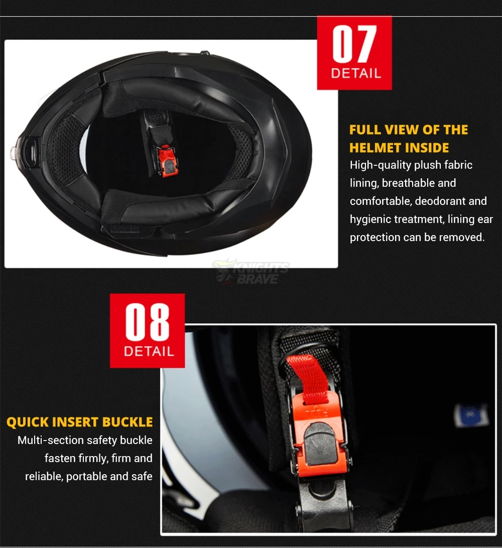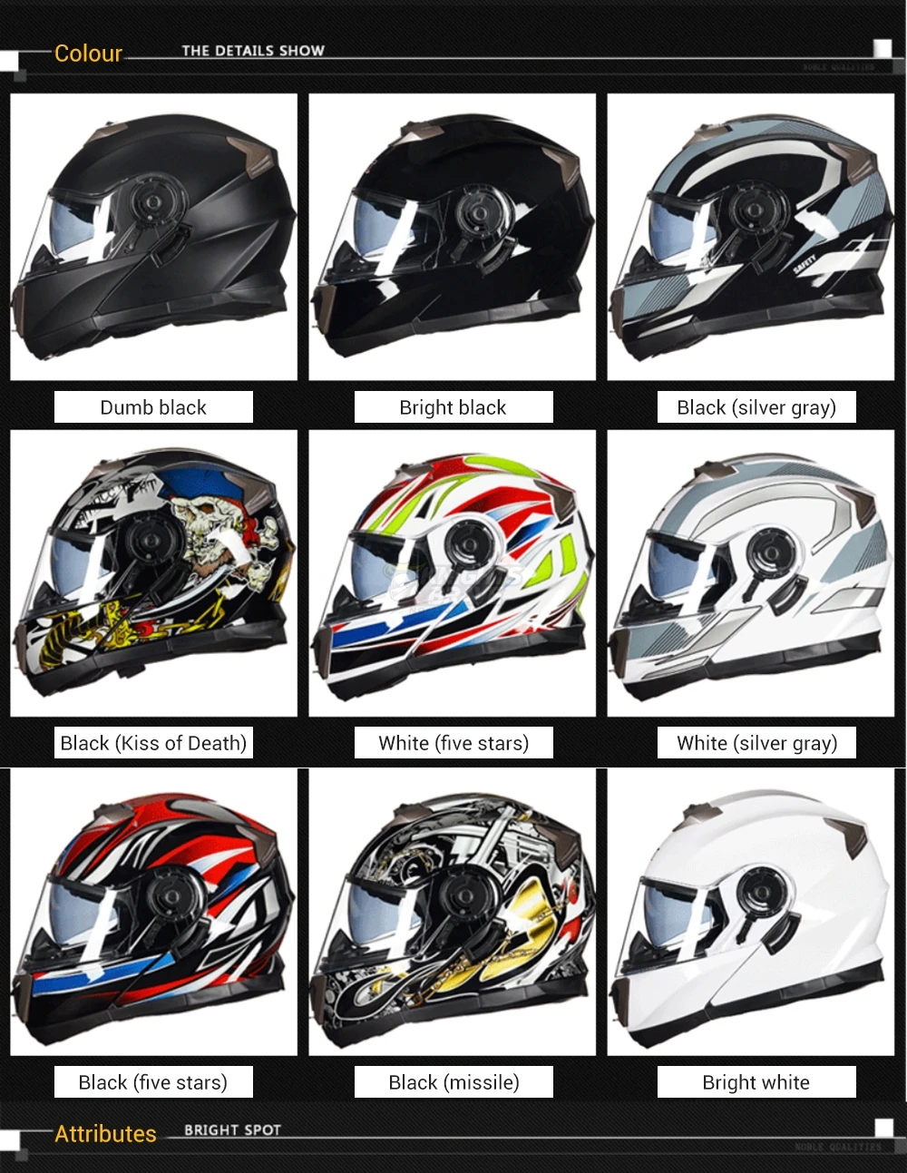 Feature:High strength ABS shell, lightweight and impact resistanceSleek and lightweight design reduces wind noiseMulti-density EPS safety buffer layer offers state-of-the-art energy absorption.Comfort soft padding liner uses breathable technical fabric, hypoallergenic, high-grade fabric, soft, ventilation, ventilation, better flexibility; more cleanlinessFlip up lenses design, provide UV protectionIntake and exhaust ports ensure plenty of ventilation to keep you coolQuick release buckle for a secure fit that will stay on your headEuropean design style, the front mouth, top and tail, make the helmet more fashionableReasonable design: Give your ride a lot of fun