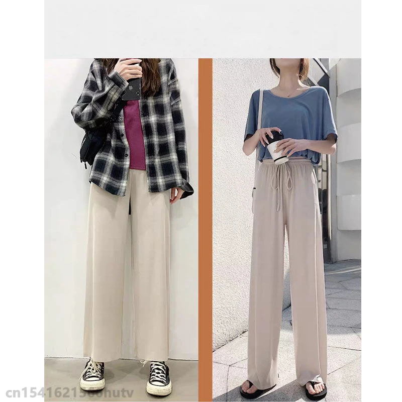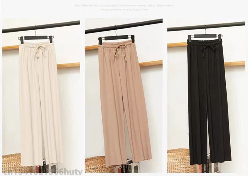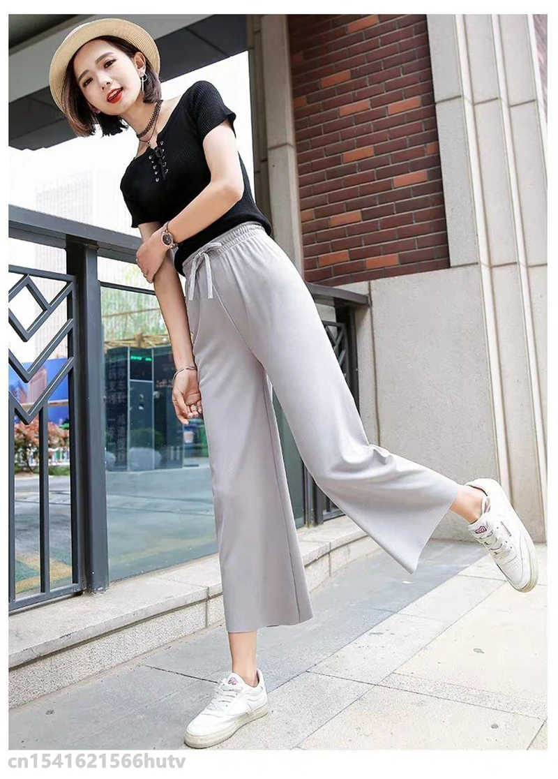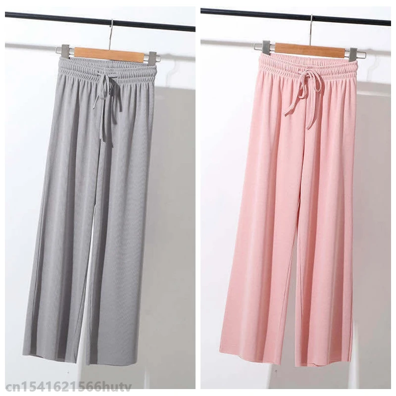 Женские свободные летние брюки Слаксы, мягкие шелковые повседневные длинные расклешенные брюки до щиколотки со льдом и шелковым подолом