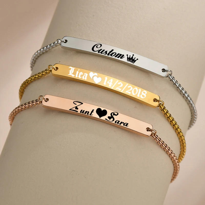 Название: персонализированный регулируемый браслет с гравировкой имени для взрослых, браслет из нержавеющей стали с буквами и датой для детей, ювелирные изделия в подарокМатериал: нержавеющая стальОсновной цвет: золотой цвет/стальной цвет/розовое золотоДлина: около 18 смВес: 6 гСлучаи: юбилей, помолвка, подарок вечерние, свадьба, день рождения, школаФункция для: друзей/пар/влюбленных/мамы/девушки/парня/папы/детей/дочери/сына