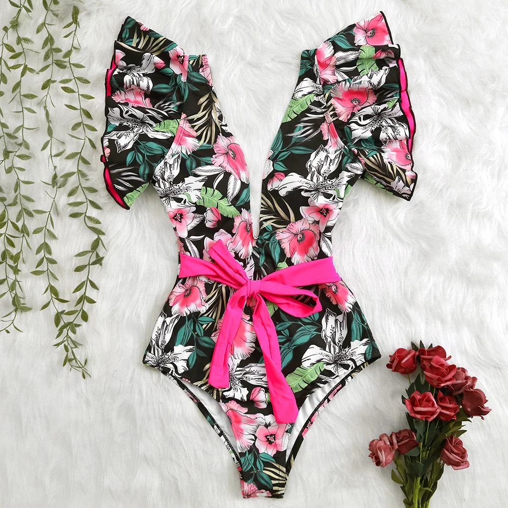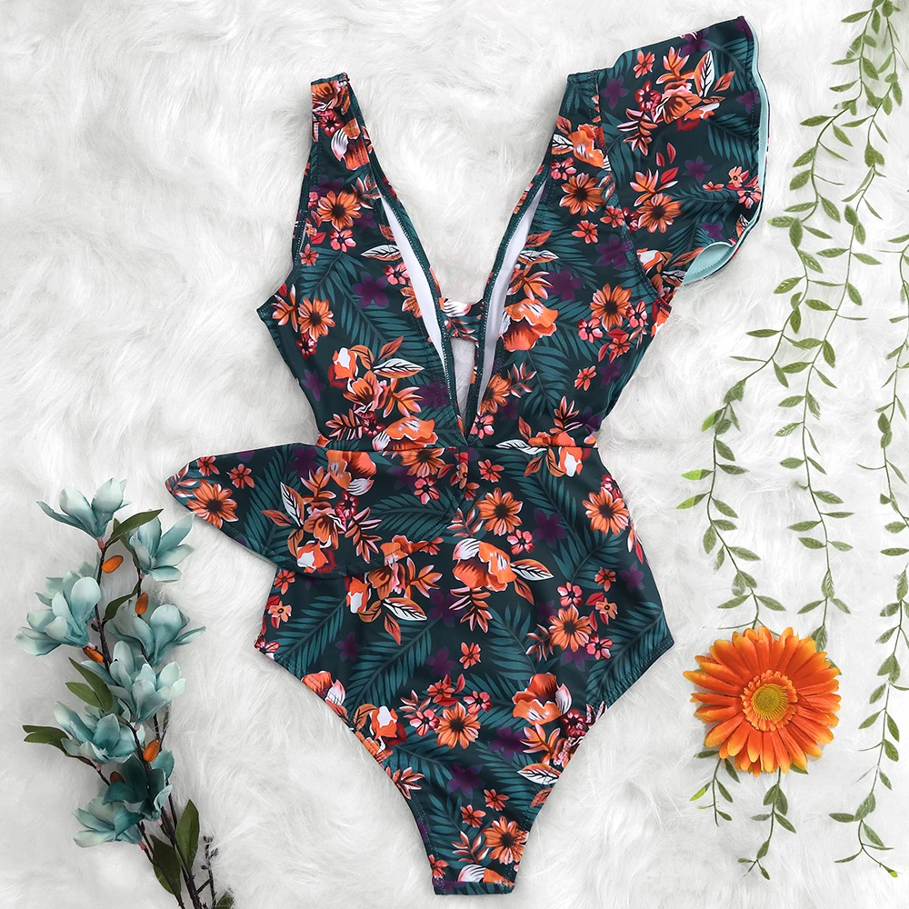 Новинка 2021, купальник с принтом, купальник с глубоким V-образным вырезом и оборками, слитный купальник с пуш-ап, пляжная одежда, монокини с открытой спиной