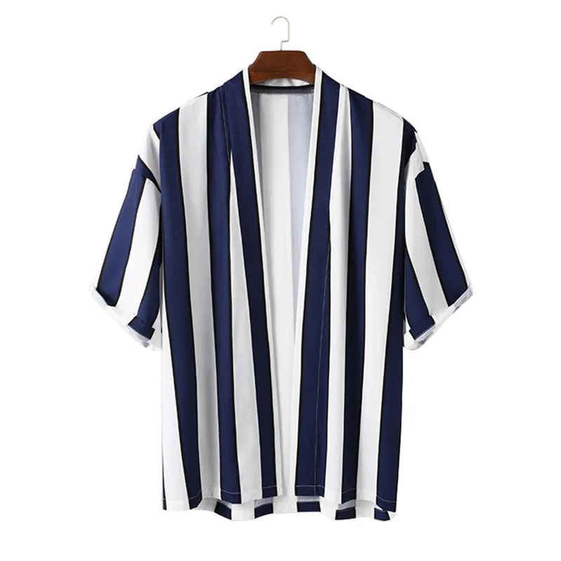 Кимоно мужское в Японскую полоску, короткий кардиган, шорты, повседневный жакет, пляжные шорты, юката, черный темно-синий цвет