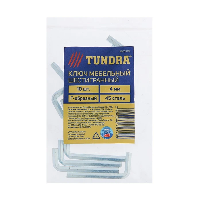 Ключ мебельный TUNDRA, шестигранный Г-образный, сталь 45, 4 мм, 10 шт. 4670379