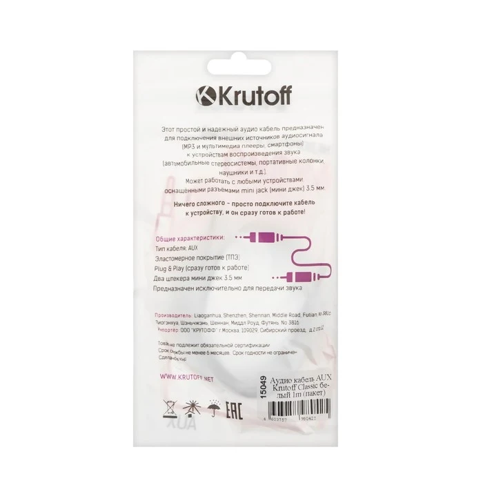 Кабель аудио AUX Krutoff Classic, Jack 3.5 мм(m)-Jack 3.5 мм(m), 1 м, белый 4849778