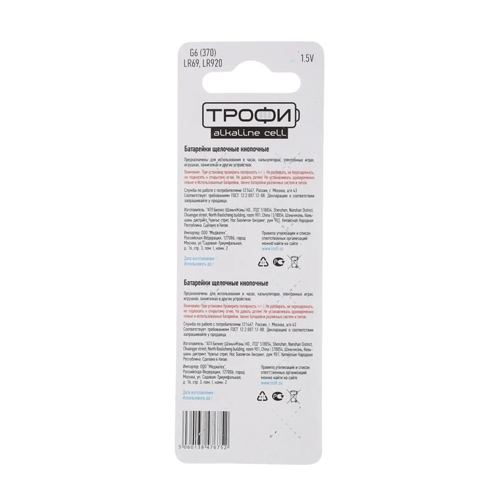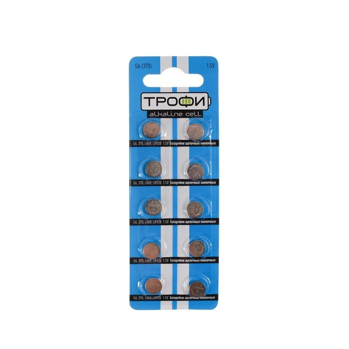 Батарейка алкалиновая Трофи Alkaline Cell, G6, 370, LR920, LR69-10 BL, 1.5 В, блистер, 10 шт 824117