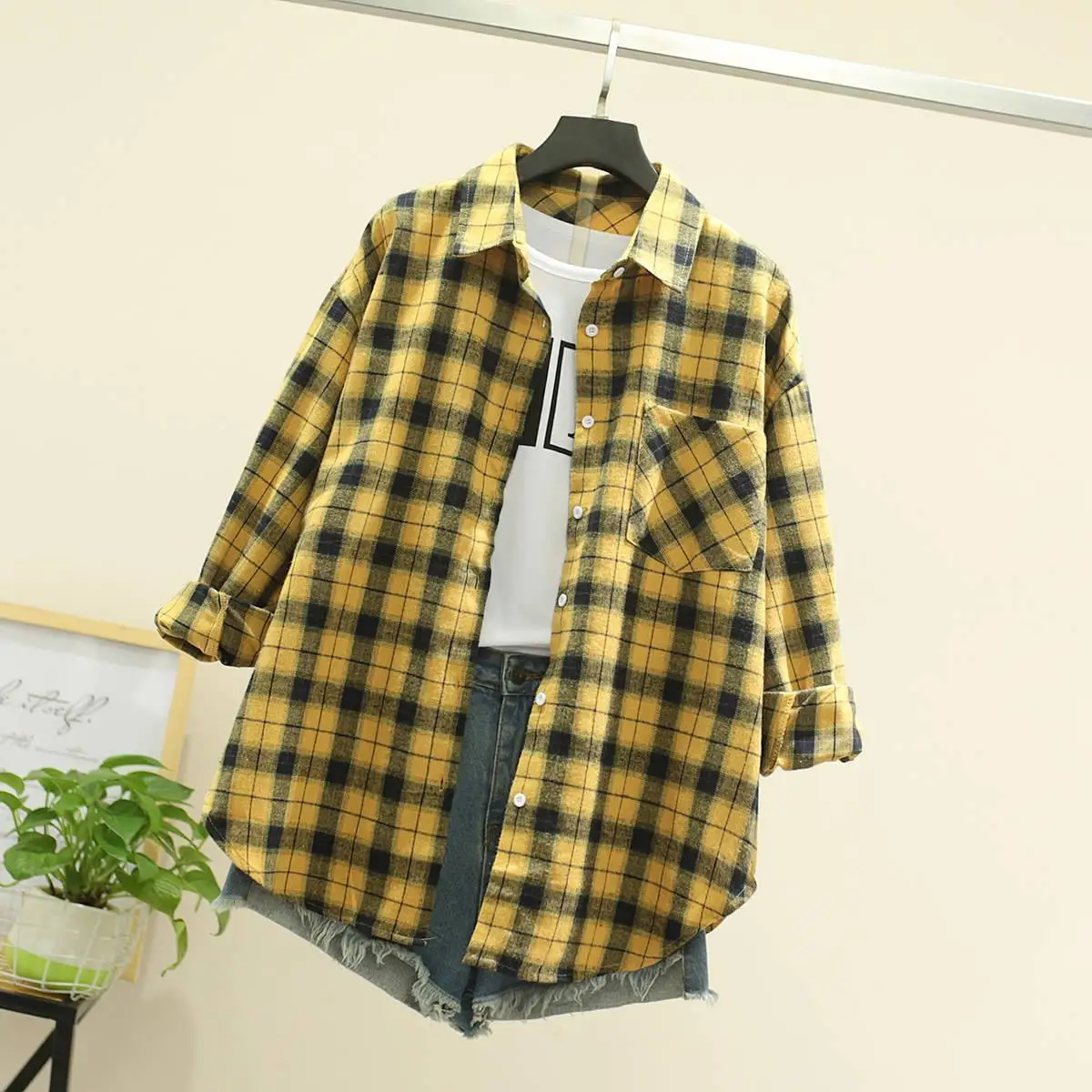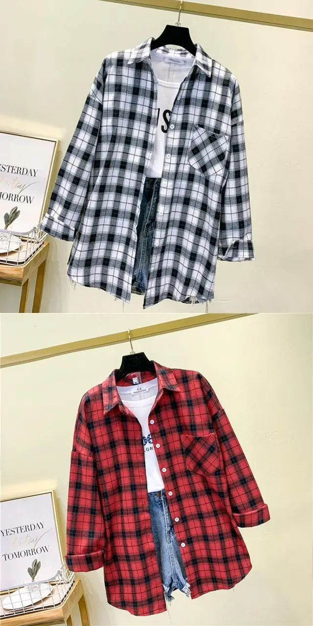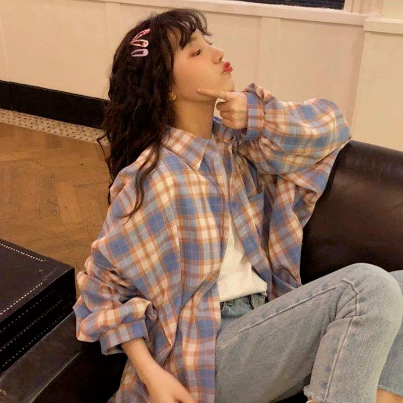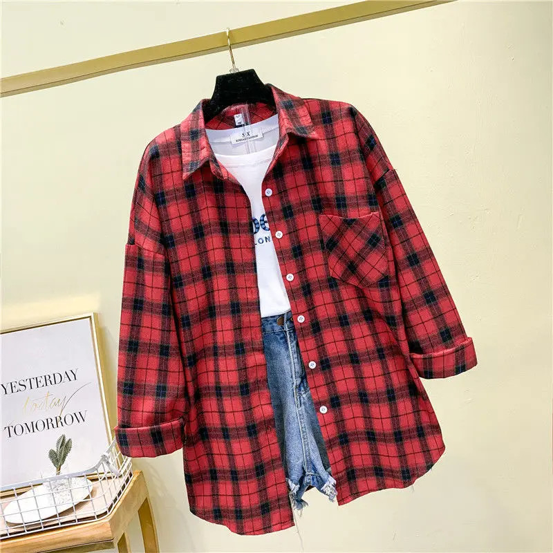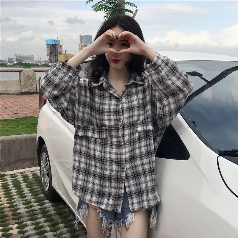Блузка женская летняя, в клетку, свободного кроя, с длинным рукавом, солнцезащитная, в Корейском стиле, студенты Харадзюку