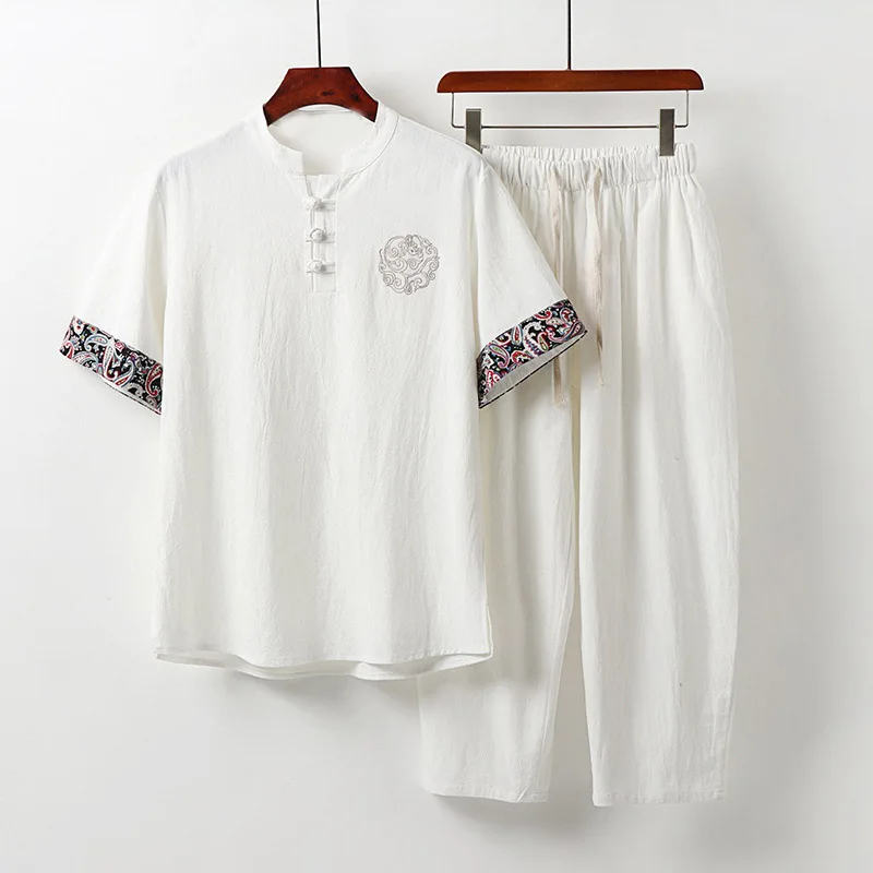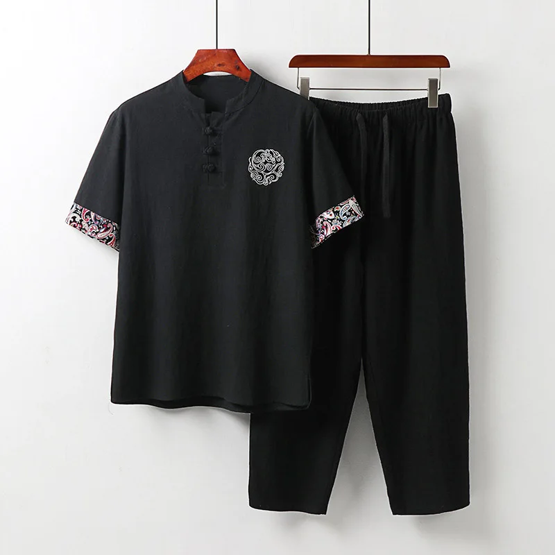 Мужская одежда больших размеров, винтажный спортивный костюм для мужа, лето 2021, синий домашний костюм, льняная футболка, модный мужской костюм в китайском стиле 8XL 9XL