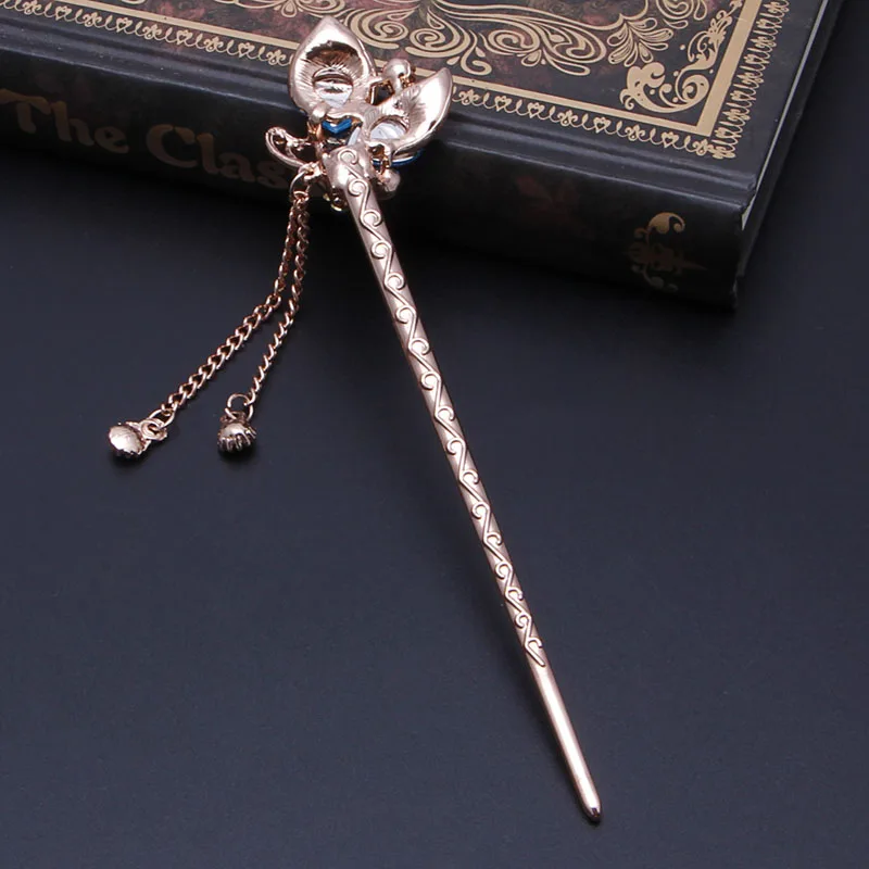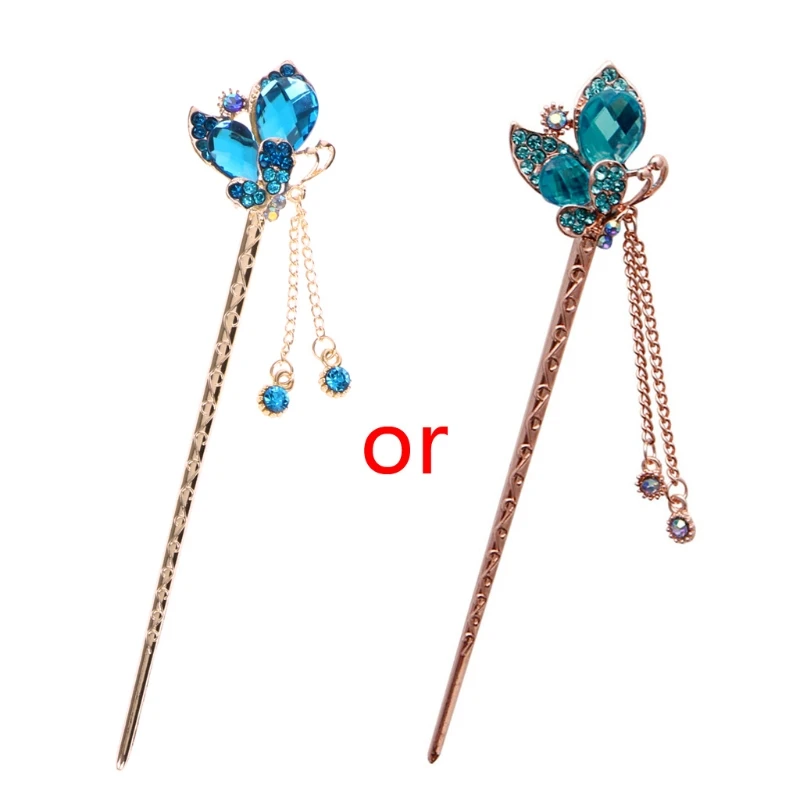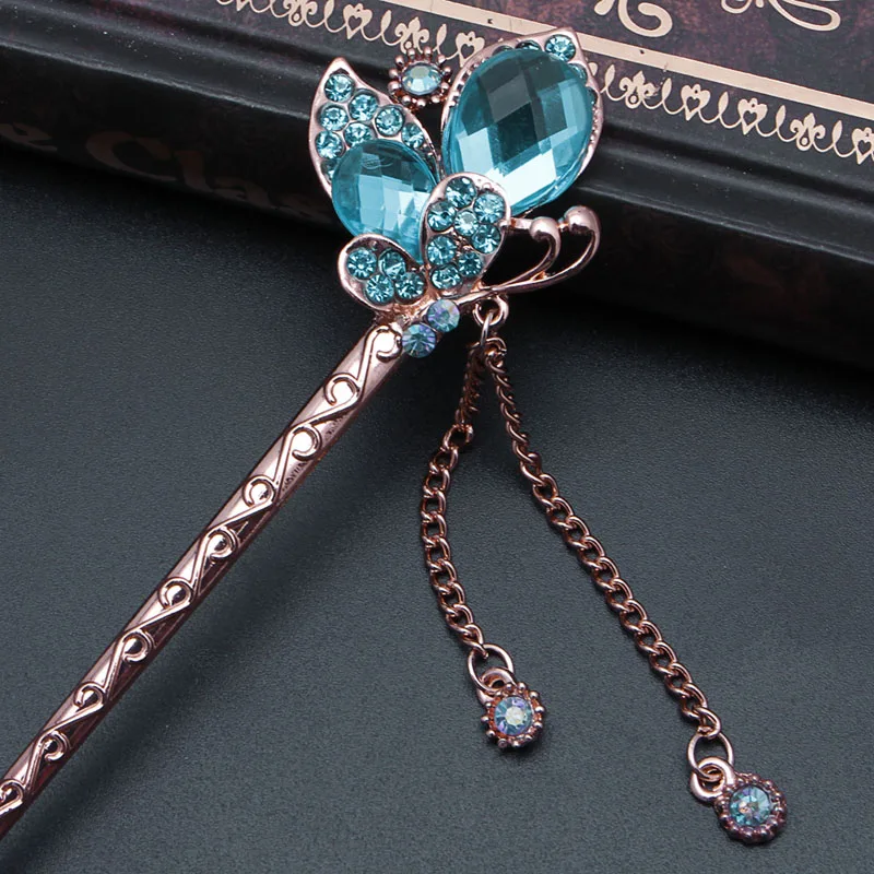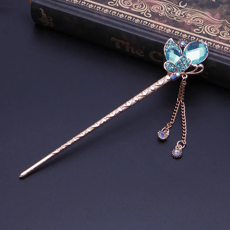 Стразы бабочка зажим для волос, головные уборы, синий заколка для волос с кристаллами, китайские волосы палочки для еды в винтажном стиле, украшенные кисточками заколка для волос для женщин