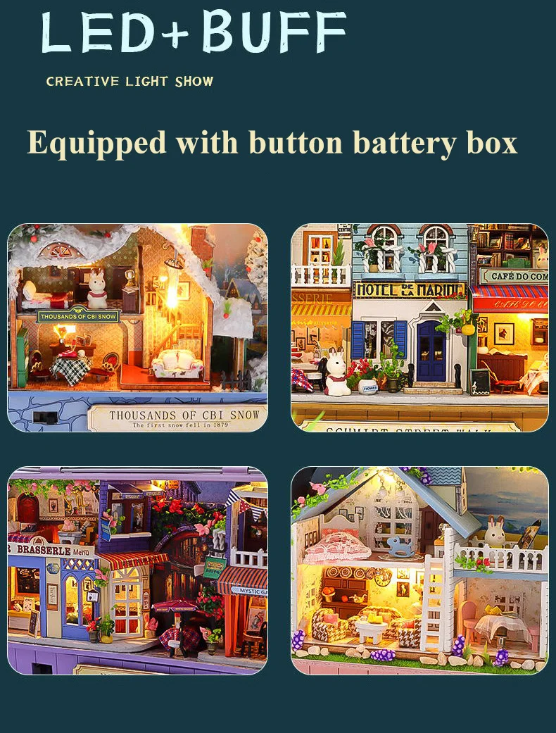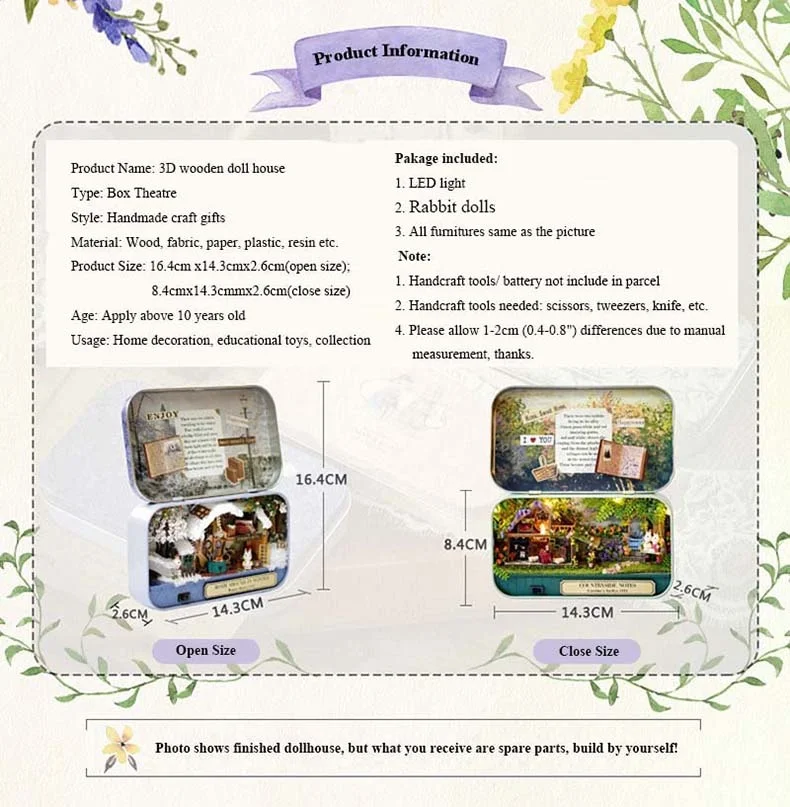 1. Товар поставляется с деталями, включает в себя всю отображаемую мебель, необходимо собрать.2. Не включает клей/инструменты/аккумулятор/музыкальную коробку/пылезащитный чехол.3. Необходимые инструменты ручной работы: бумажные ножницы, нож, устройство для изготовления отверстий, точные пинцеты, отвертка, клей.4. Руководство: с красочной инструкцией в посылка.