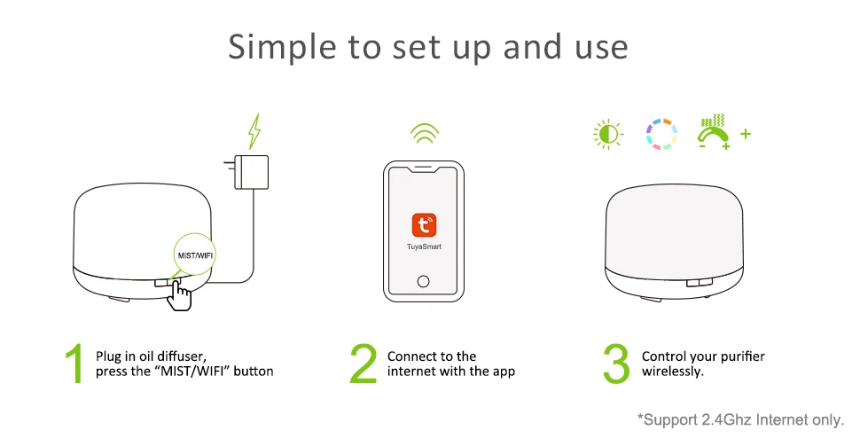 Мы выслушали мнение наших клиентов и сделали большое улучшение в декабре. Этот невероятный диффузор эфирного масла использует новейшие технологии, чтобы вы могли идеально контролировать его только с помощью приложения! Загрузите приложение Tuya Smart, которое подходит для каждого смартфона и планшета для вашего удобства, и включите и выключите очиститель или измените режим. Диффузор совместим с Amazon Echo, поэтому он может работать с Alexa для удобства использования.