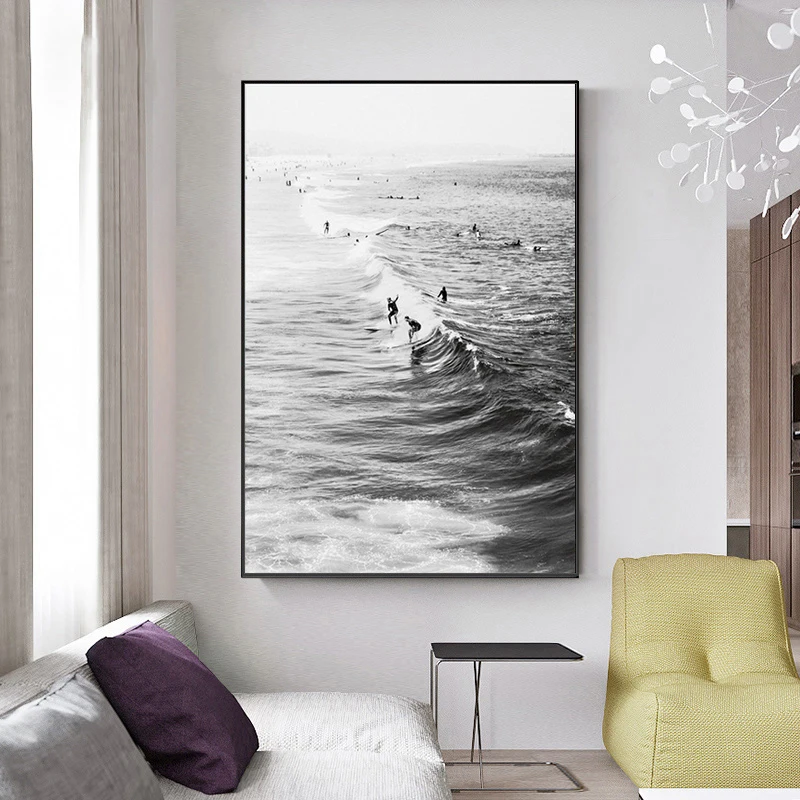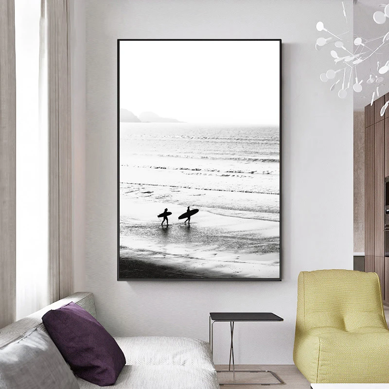 Картина на холсте из микроавтобуса, пляжа, серфинга, черно-белый постер Калифорнийского океана, картина для гостиной, домашний декор
