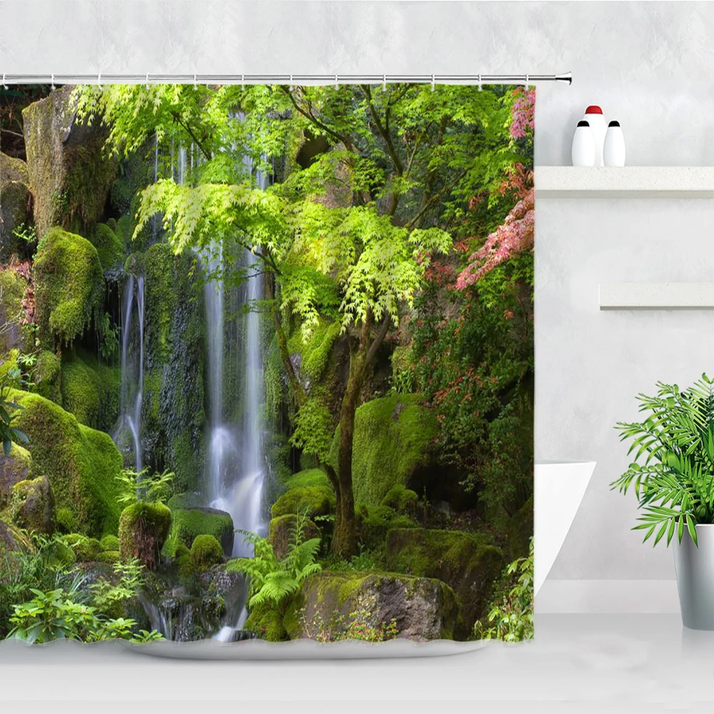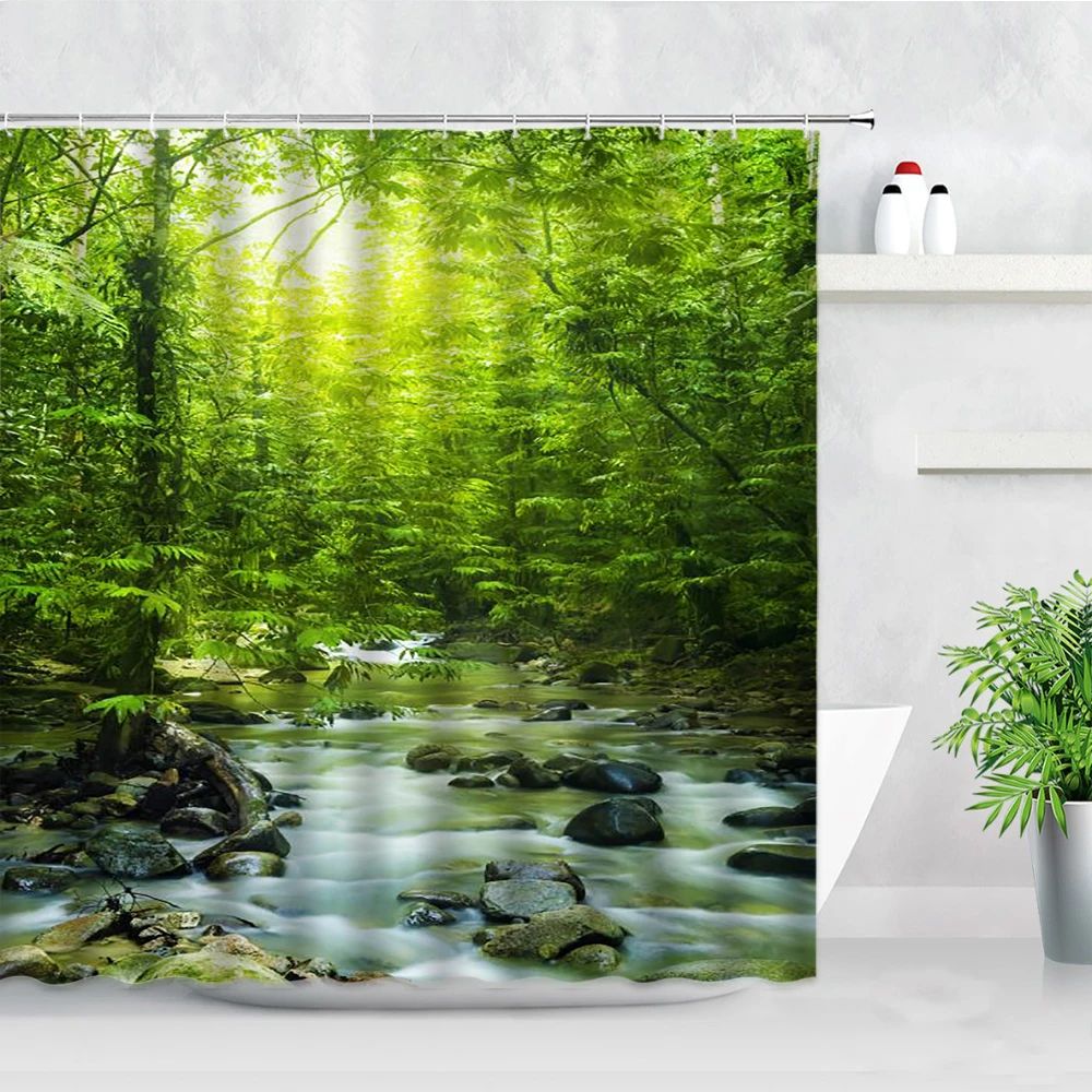 Занавески для душа с зеленым лесом, водонепроницаемые шторы из поли...