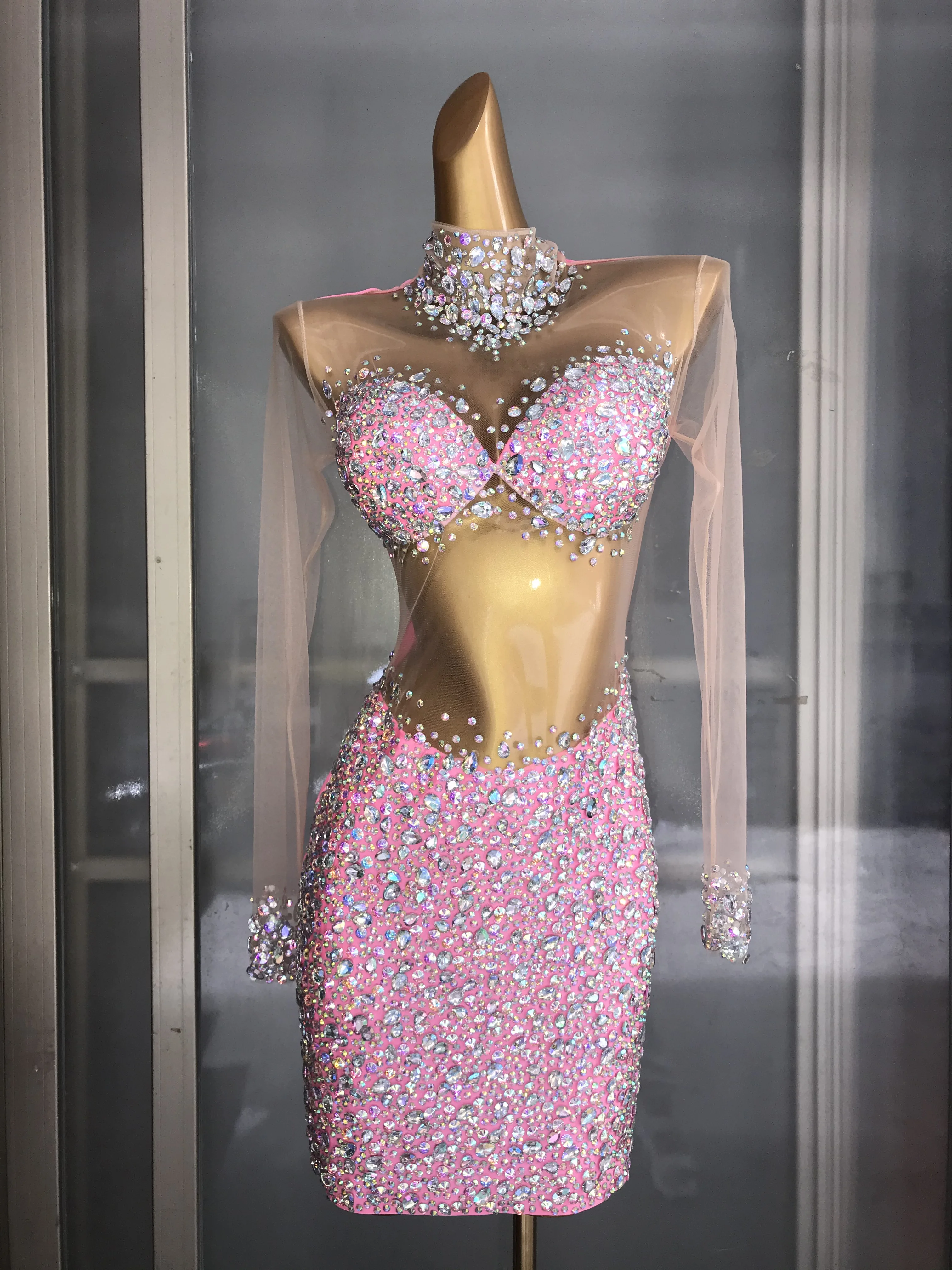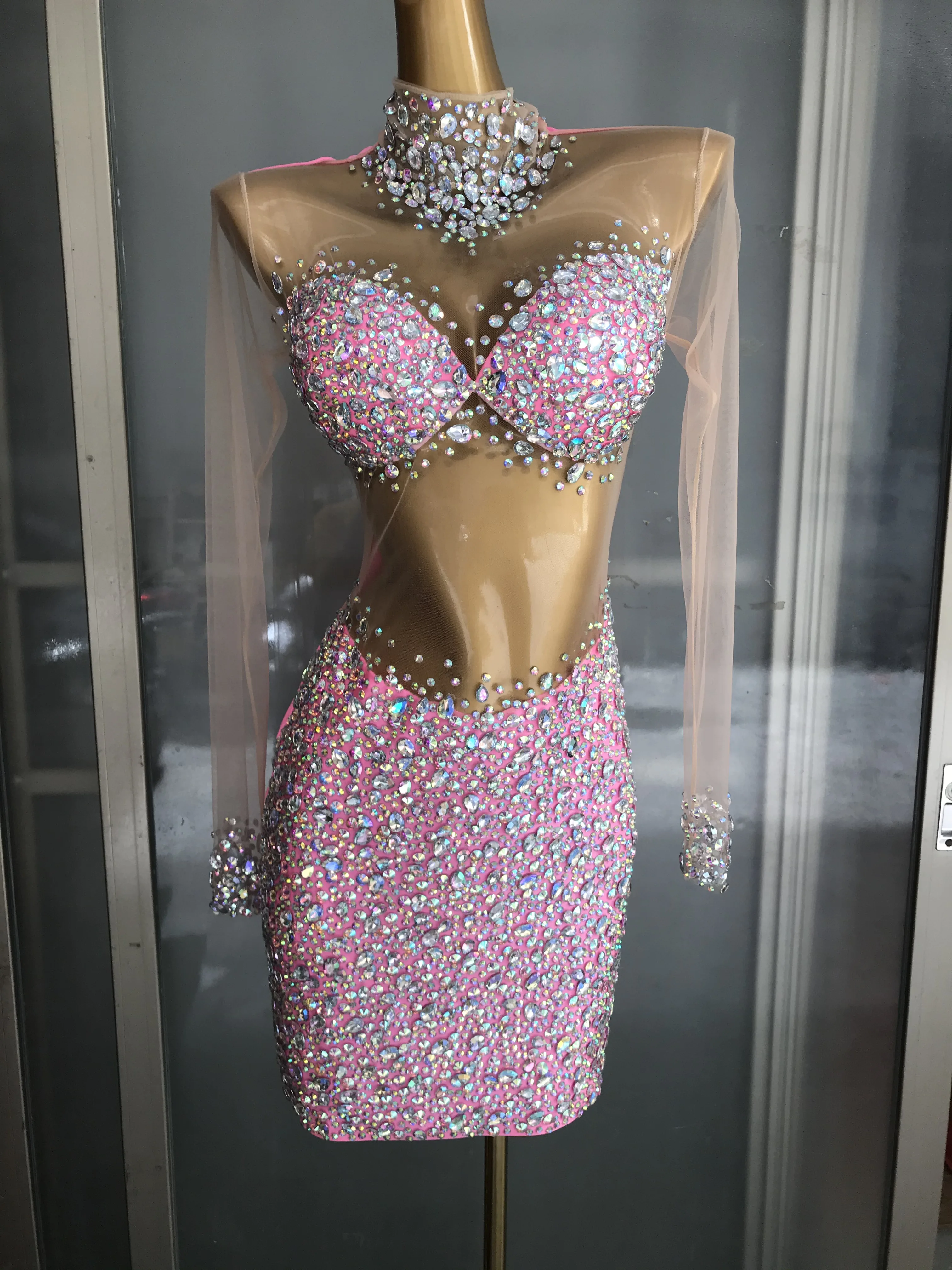 Блестящее розовое Прозрачное платье AB Стразы, женское платье для празднования дня рождения с прозрачными камнями, танцевальное платье