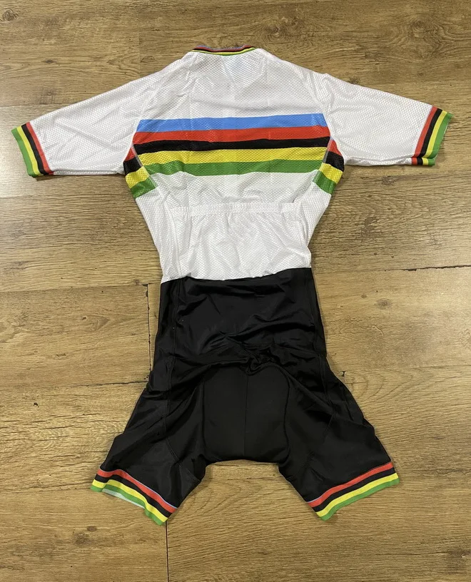 Лазерная резка для мужчин, для катания на горном велосипеде, Велоспорт Джерси костюм скафандр с диапазон мощности чемпион мира Радуга гелевая Накладка Размер XS-4XL