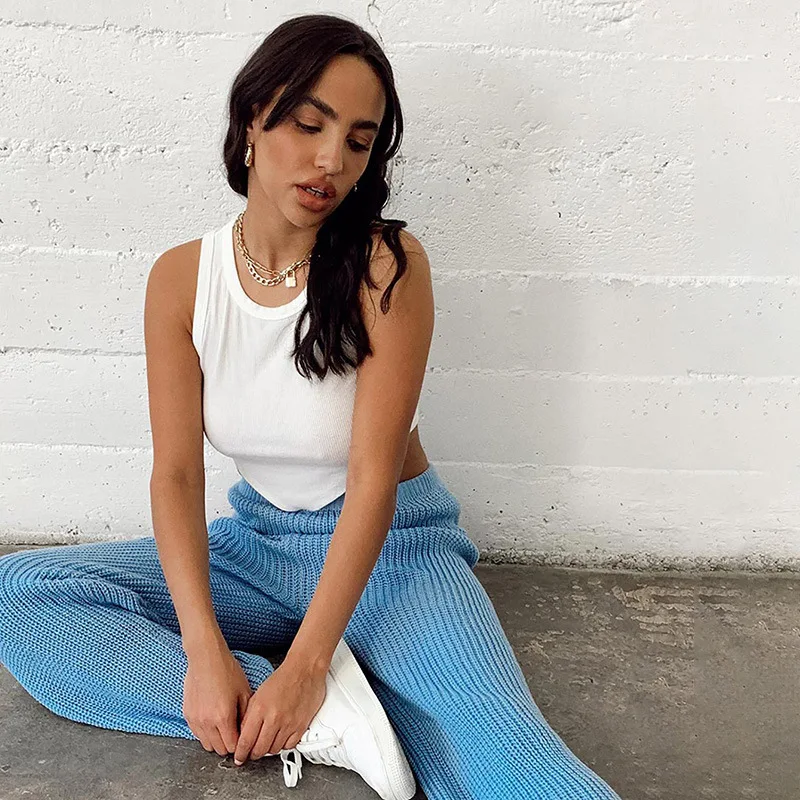 Повседневные майки, пикантный укороченный жилет, Однотонный женский вязаный синий белый летний топ с открытыми плечами, женские майки без рукавов