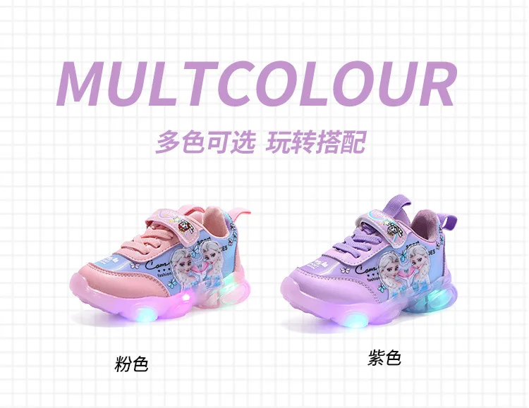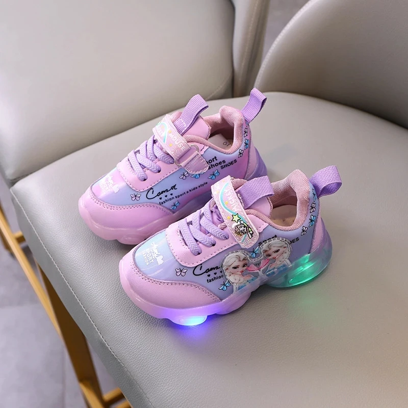 Детские спортивные туфли на плоской подошве Disney Princess, светящиеся кожаные туфли для мальчиков и девочек с блестящей подошвой в стиле Эльзы, Детские светящиеся кроссовки