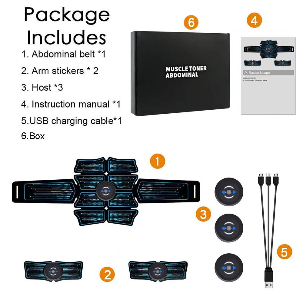 Package Includes3* Main unit, 1*Abdominal Belt, 2*Arm Stickers, 1* USB charging cable