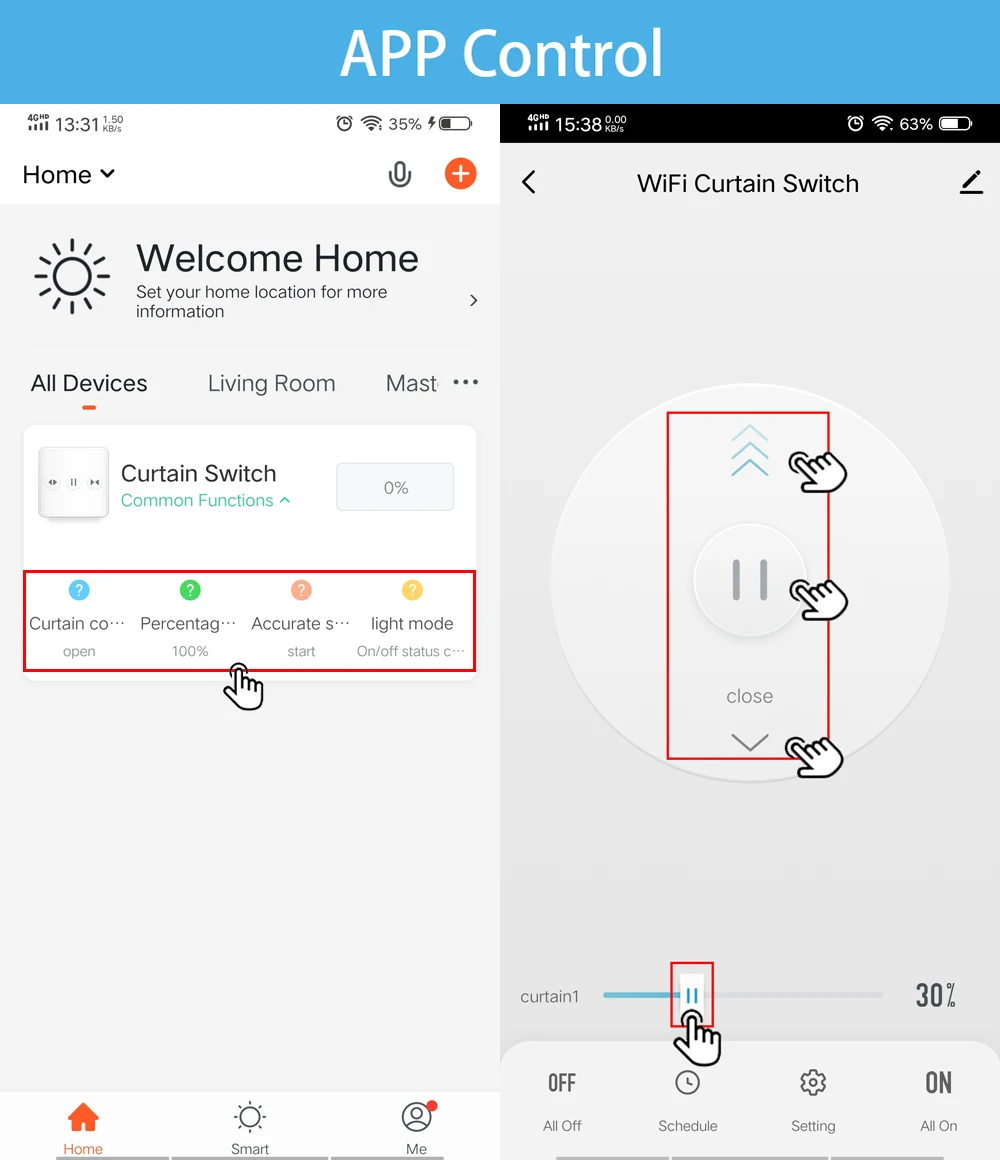 -Управляйте переключателем штор удаленно-Установите расписание для того, когда открывать, когда закрывать-Откройте/закройте занавеску в процентах-Разворот двигателя-Точная калибровка хода-Быстрая калибровка ходаСветильник: Установите статус вкл/выкл светодиодной подсветильник Ки