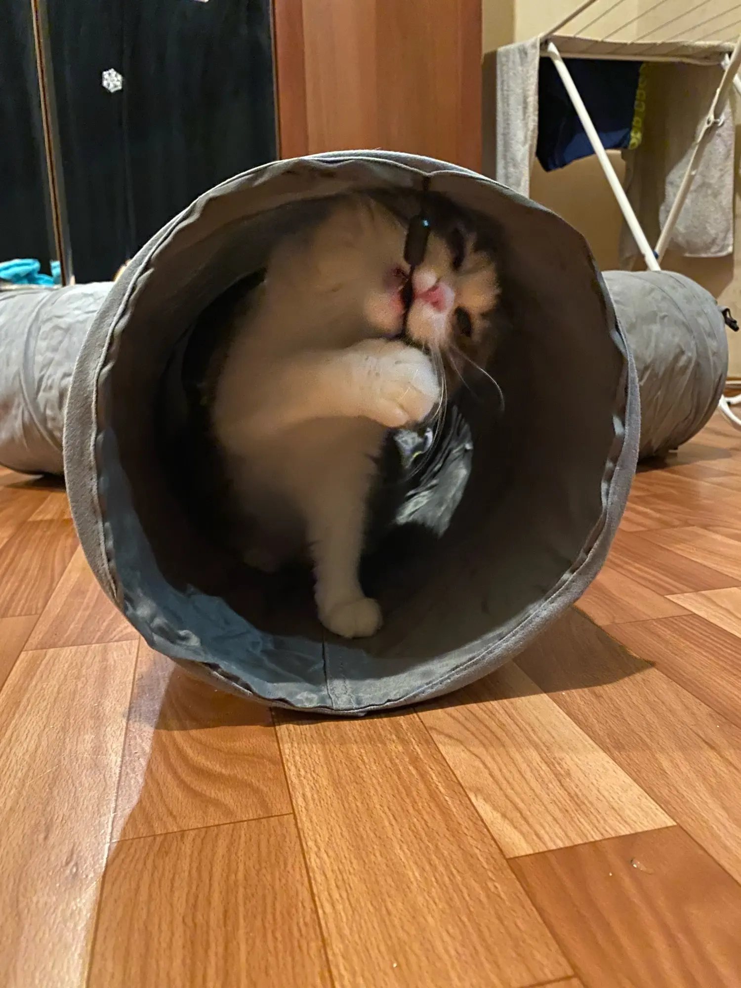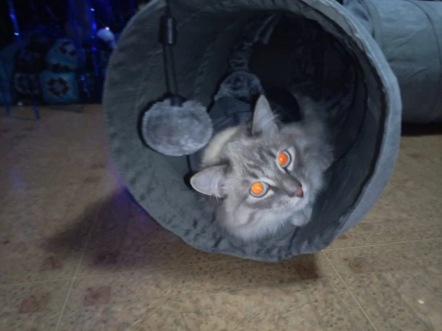 Качественный туннель, сверху обшит мягкой серый красивый тканью, в середине шуршит, котейка Рада бегает