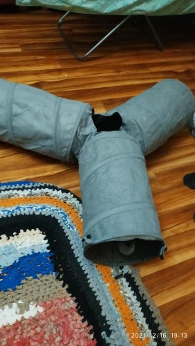 Коту туннель понравился. Как только достала и положила на пол, начал скакать как дикий в нем и на нем. Но на следующий день энтузиазма поубавилось..может залезть в него и лечь там спать. Ткань не плохая, в центре шуршит как полиэтиленовый пакет(видимо для привлечения кошачьего внимания), но очень много длинных ниток торчит изнутри. Доставили на удивление очень быстро. Заказывала 11.11, а доставили 14.11 курьером.