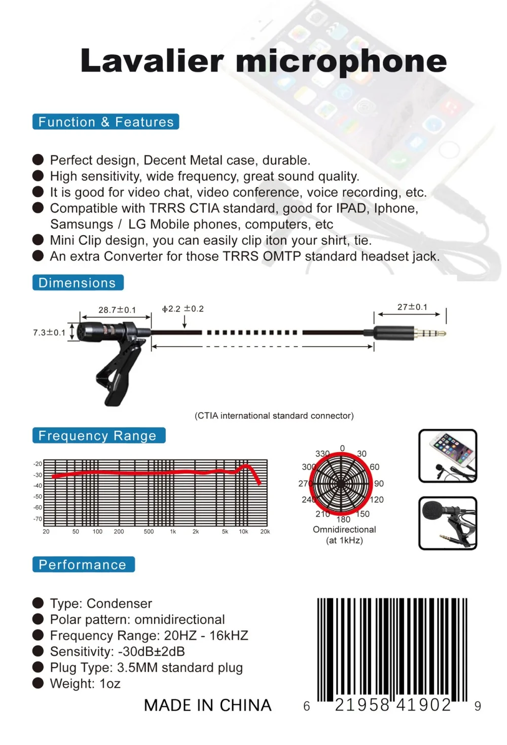 Предлагаем оптовую цену, пожалуйста, свяжитесь с нами.Полиэтиленовый пакет 0,02 КГ (пакеты для упаковки по умолчанию)Преимущества товара:Проволока: используется высококлассный материал s APS, есть корневой медный провод 30*12, одножильный экранированный провод, хорошо экранированный, очень прочный, длина 1,5 м, можно использовать без активности,Микрофон: импортный микрофон не издает воя, голос чистый, подходит для всех мобильный телефон брендов.Ремесло: собственное производство на заводе, гарантия качества, будьте уверены в покупке!Характеристики продукта:Размер микрофона: Φ6,0X2,2 мм высокочувствительный микрофон с защитой от помехЧувствительность:-32 дБ ± 1 дБНаправление: полная точкаИмпеданс: ≤ 2.2комРабочее напряжение: 2,0 вЧастотный диапазон: 100-16 кГцСоотношение сигнал-шум: большой в 60 дБДиаметр штекера: 3,5 ммИспользует этот микрофон стандарта CTIA (широко известный как американский стандарт)Roogo Your мобильный телефон-стандарт OMTP (широко известный как национальный стандарт)Рекомендуется использовать с одним разъемом для обеспечения нормального использования.3-полюсный общий разъем для микрофонаОдножильный экранированный кабель (30 очень медных проводов)
