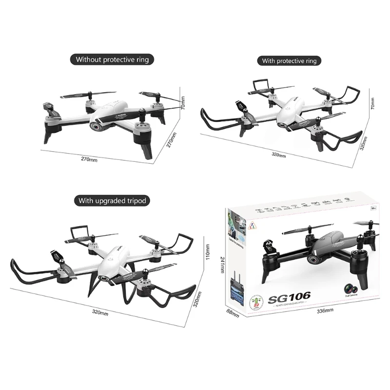 X9FC RC Дрон SG106 720P/1080P/4K Одиночная/Двойная камера оптический поток портативный воздушный пульт дистанционного управления Самолет RC КвадрокоптерOOTDTYХарактеристики: высококачественные материалы: изготовлены из квалифицированных пластиковых материалов и электронных компонентов, идеально обеспечивают стабильность и гарантируют легкость работы дрона.Конструкция неисправности: может быть подключен мобильный телефон, двойной режим через мобильный телефон управление приложением и пульт дистанционного управления, также носить со встроенным датчиком жестов, чтобы делать фото или видео автоматически.Простота зарядки: прилагается usb-зарядка, оснащен внешним аккумулятором емкостью 1600 мАч и usb-зарядным проводом, прост в зарядке и эксплуатации.Высокая Гибкость: высокая четкость, несколько режимов съемки, переноска с функцией отслеживания портретов и режимом без головы, а также легкая аэрофотосъемка.Одна кнопка возврата домой: умный дизайн возврата одной кнопки, прост в эксплуатации и эффективно экономит ваше время, если вы свободно меняете другие сцены, переносите с помощью режима g-датчика через мобильный телефон-контроль.Спецификация: размер упаковки: прибл. 336x241x88 мм/13,23x9,49x3,46 дюймовВес брутто: прибл. 537 г/1,18 фунтовВариант модели: черный цвет с одиночной камерой 720P/черный цвет с двойной камерой 720P/черный цвет с двойной камерой 1080P/черный цвет с двойной камерой 4K/белый цвет с одиночной камерой 720P/белый цвет с двойной камерой 720P/белый цвет с двойной камерой 1080P/белый цвет с двойной камерой 4KПараметры объектива: 720P/1080P/4K пикселей высокой четкостиПульт дистанционного управления Источник питания: 2 батареи AA (посылка не включена)Тела Батарея: внешний Перезаряжаемые Li-Ion Батарея пакет 3,7 V 1600 мА-чМатериал: АБС-пластик + электронные компонентыПродолжительность работы батареи: прибл. 22 минутыВремя зарядки: прибл. 150 - 180 минутРасстояние дистанционного управления: около 100 метровРежим управления: 2,4 ГГц пульт дистанционного управления/мобильный телефон App управлениеПосылка включает в себя: 1 RC самолет1 х USB кабель для зарядки1 х пульт дистанционного управленияАккумулятор-1 шт.4 x защитная рамка2 x Шасси4 x ветровое лезвие1 отверткаРуководство по эксплуатации-1 шт.Примечание: возможны отклонения на 1-2 см вследствие измерений вручную.Из-за разницы между различными мониторами изображение может не отражать фактический цвет изделия.