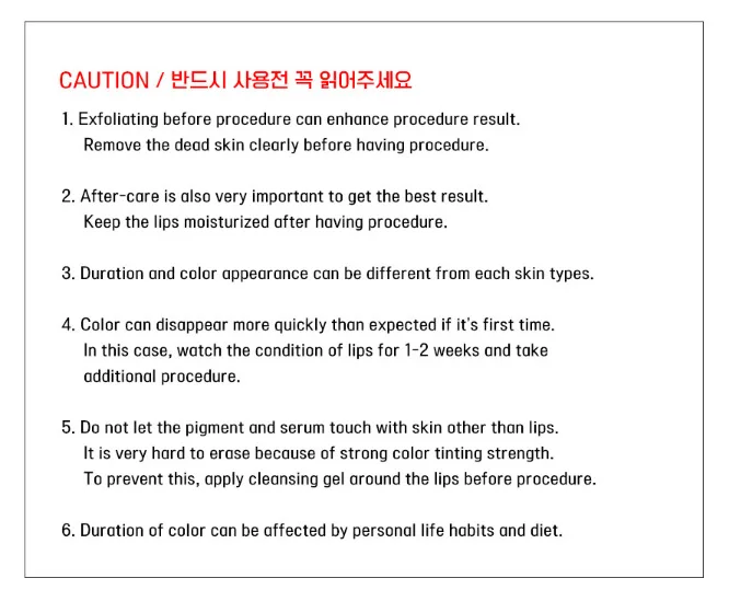 Романтический Красный ингредиент:Аква, натрия, гиалуронат бутилен йколь, глицерин, ноциномид, Cl 15850, гидролизованный коллаген, понтенол, чамокипарис обтуса вода, Бето-глюкон, комеллио синенсислеф эктророзия воды, centella Asiotica Extroct,Anthemis Nobilis Flower Extroct, hamomels vrginianetrockotaloe BarbodensisLeaf ExtroctPalmitoy Pentopeptide-4. Acety Hexapeptde-8, медные Tripeptide-1.Trnexamic AcidPolysorboate 20,12-гексонедилалантоиндипотосиум Gyrthizote,Adenosine,Disodum EDTAЦветочный розовый ингредиент:Аква, гиолурант натрия, бутилен глеолцерин, ниоциномид, 0l45410, диоксид титана, гидролизованный оллген, понтенол, чамока порис обтуса воды, Бето-глюкон центеллы Asiotica Extroct, Anthemis Nobils цветок Exroct,Homamelis Virginina Extroct, листьев алоэ Extroct,Palmitoy Pentopeptide-4,Aoety Hexopptide-8, Медь Tripeptide-1,Tronexomic кислотный, Polysortbate 20,12-HoeondillitoinDipotassium Glycyrrtizote,Adensine, динатриевая соль этилендиаминтетрауксусной кислотыСладкий оранжевый ингредиент:Аква, содум гиалуронат, бутиленгликоль, глицерин, ниоциномид, а 12085, гидролизованный коллаген, пантендил, чамоекипарис обтуса вода, бета-глюкан, камеллио синенсилезония экстракт воды, экстракт центеллы Asiatica, антемис Nobilis цветок Extroct,Homamelis Vrginina ExtroctAloe барбоденсиsleof ExroctalmitoyPentapeptid-4Acetyl Hexopeptide-8, медные Tripeptide-1, транэксоминовая кислота, полисорботы 20,1.2-Henxnedi,lantoin,npotossim Gymhizote,Adenosine, diнатрия EDTA* Чтобы сохранить цвет и продлить срок,Нанесите восстанавливающий крем два раза в день (утром и ночью) в течение 3-5 дней S2) последовательно наносите оттенок губПродолжительность сеанса: в среднем две недели (зависит от типа кожи и после ухода) * Лучший рекомендуемый цикл лечения, чтобы сохранить цвет чистым и длинным-Всего 3 ~ 4 сеанса (1 ~ 2 недели интервала между каждой сессией)-Период интервала должен определяться относительно состояния губ клиентаВнимание:1. Отшелушивание перед началом процедуры может повысить результат процедуры. Перед началом процедуры удалите омертвевшую кожу.2. После ухода также очень важно получить лучший результат. Увлажните губы после проведения процедуры.3. Продолжительность и цвет могут отличаться от каждого типа кожи.4. Цвет может исчезнуть быстрее, чем ожидалось, если он первый раз. В этом чехол, наблюдайте за состоянием губ в течение 1 -2 недель и совершите дополнительную процедуру.5. Не позволяйте пигменту и сыворотке касаться кожи, кроме губ. Очень трудно стереть из-за сильной силы окрашивания.Для предотвращения этого нанесите очищающий гель вокруг губ перед началом процедуры.6. Продолжительность цвета может зависеть от личных привычек жизни и диеты.