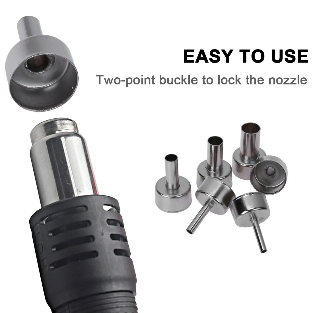 1. Подходит для 858 серии различных спецификаций воздушного пистолета 2. Подходит для различных станций сварки горячим воздухом 3. Высокая термостойкость, отсутствие утечки воздуха, легкая замена, 4. Двухточечная застежка фиксирует воздушную насадку, которая проста в эксплуатации; 5. Избегайте попадания горячего воздуха из зазора между соплом и стальной трубой на выходе пистолета горячего воздуха