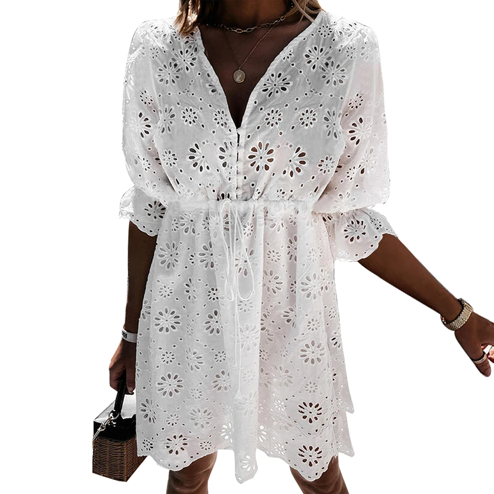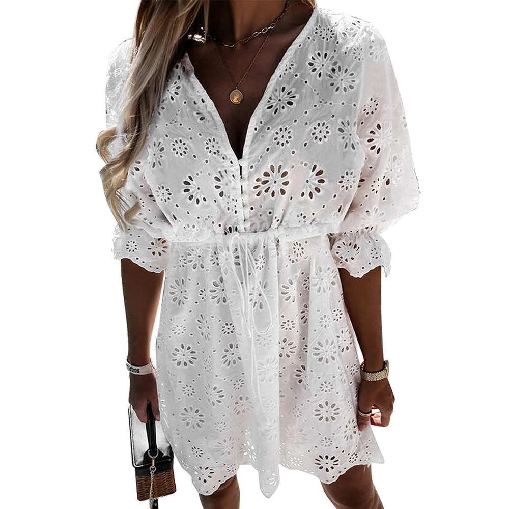 Летнее сексуальное платье с v-образным воротом, мини-платье А-силуэта для женщин кружева "гусиные лапки" Вечерние платья с короткими рукавами и отверстиями на верхнем слое Bodycon Vestidos 2021