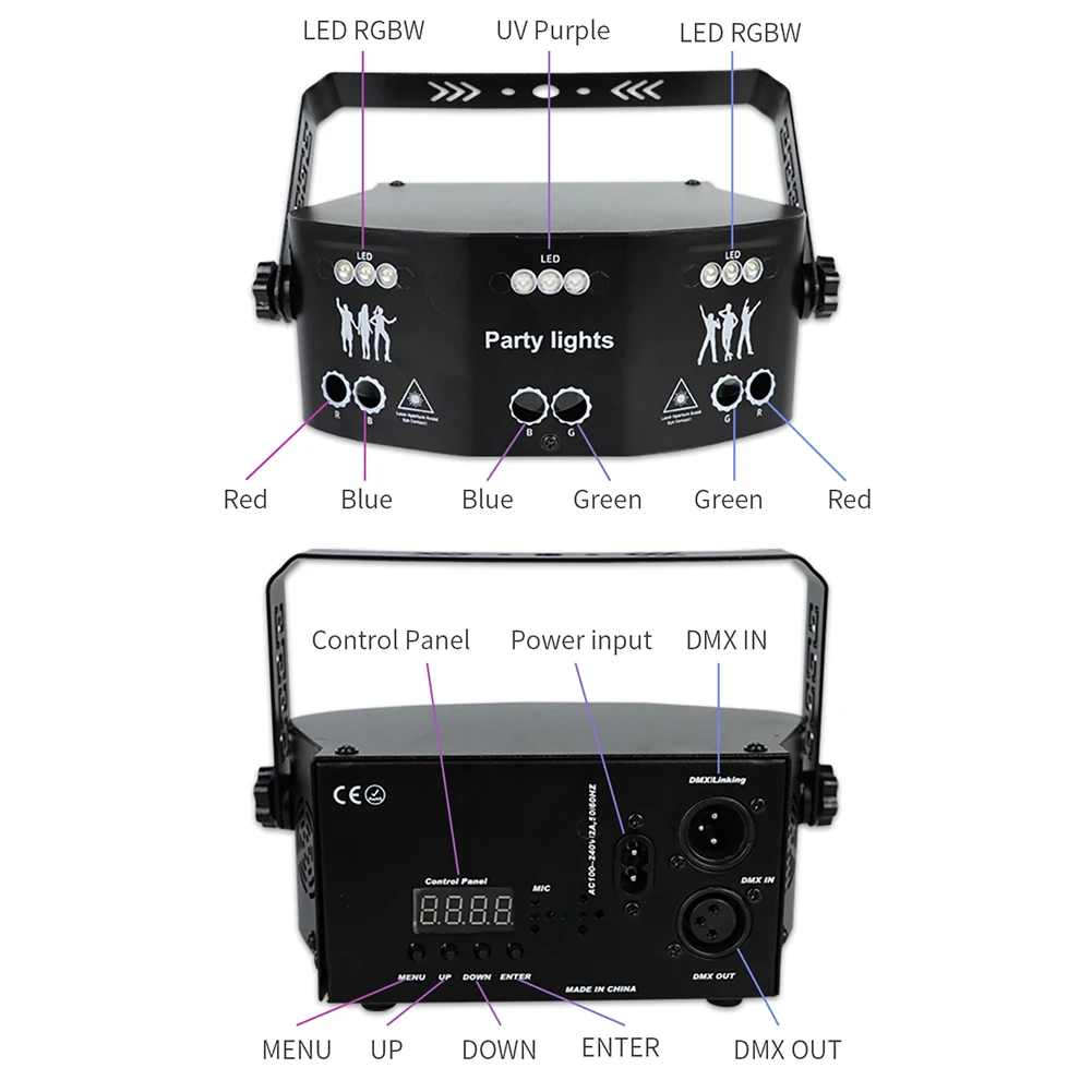 Профессиональный Сценический светильник RGB с цветным пультом дистанционного управления, атмосферная лампа, Активированный звук, лазерный проектор, светильник ing для DJ Disco Dance Bar PubХарактеристика:Высокая яркость лампы, яркий и мягкий цвет, хорошая производительность цветопередачи.Сигнал DMX, свободное управление, одновременная работа нескольких ламп и фонарей.Мощное тепловыделение, мощный вентилятор, высокопроизводительное тепловыделение.Спецификация:Источник питания: AC110-240,50 Гц/60 ГцСтробоскоп-светильник: трехцветный RGB светильник + УФ-лампаМощность: 500 мВтРежим управления: DMX-512/Голосовое управление/самоходный/мастер-рабМощность лазера: Красный: 200/Зеленый: 50/синий: 150Система сканирования: высокоточное сканирование шагового двигателяРазмер посылка: 245x153x141mmРазмер изделия: 185x90x80 ммВес изделия: 1150 гВилка: ЕС/Великобритания/СШАПримечание:В связи с различиями мониторов и эффектами освещения реальный цвет товара может немного отличаться от цвета на фотографиях. Спасибо!Возможны отклонения в 1-2 см вследствие измерений вручную.
