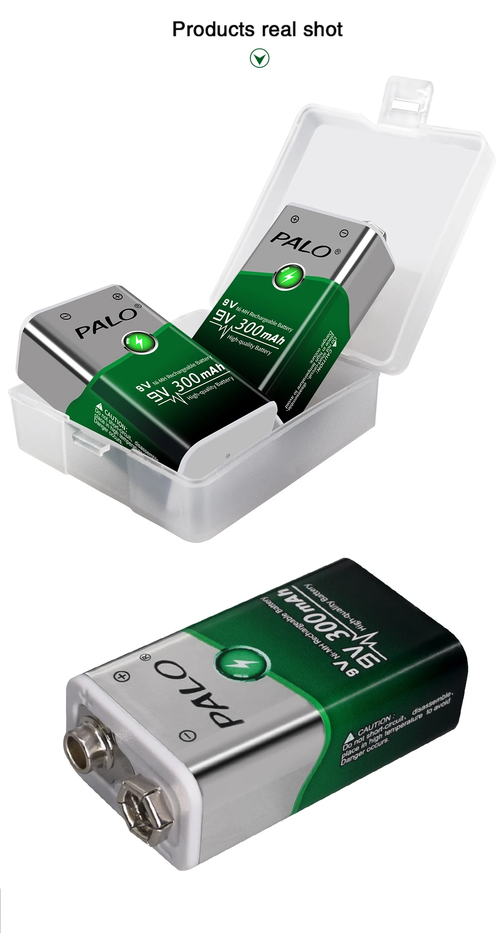 Описание продукта: Для зарядного устройства:Это зарядное устройство может заряжать один или два аккумулятора 9 В, Ni-MH,NI-CD. Более того, зарядное устройство использует технологию управления MCU, обеспечивая постоянную модель безопасности тока и постоянного напряжения. Свет выключится, когда батарея полностью заряжена. 1. Подходит для любого напряжения питания по всему миру.2. Это зарядное устройство использует технологию управления MCU, обеспечивая постоянный ток и постояннуюНапряжение модель безопасности.3. Зарядное устройство зарядит аккумулятор при подключении, а индикатор светится синим цветом.4. Только зарядка для одного или двух шт. 9V lithum, Ni-MH,NI-CD батареи, не заряжаются дляДругие типы батарей.Вход: 100-240 в перем. Тока Макс.: 100 мАВыход: 9 В постоянного тока 90 мАБез нагрузки потребляемая мощность: 1 Вт МаксМаксимальная потребляемая мощность при полной нагрузке: 5 ВтСкорость зарядки аккумулятора: >90%Размер: 90 мм x 60 мм x 37,4 ммВес: 46,6 гДля аккумулятора 9 в:Преимущества низкого саморазряда батареи:1, высокая скорость удержания заряда.2, сильная сохраняемая способность напряжения батареи.3, низкий уровень потери емкости батареи.4, долгий и стабильный Срок службы батареи.5. Высокая температура разрядки. Особенности:1. Тип: аккумуляторная батарея2. Емкость: 300 мАч3. Напряжение батареи: 9 В4. Химия: Ni-MH5. Вес: 30,5 г Внимание:Аккумулятор должен быть полностью заряжен перед первым использованием.Аккумулятор находится в прохладном и сухом месте.Не отделять, не выдавливать и не ударять.Не кладите батарею в воду и огонь.Беречь от детей.Пакет включает в себя:1 шт. * 9 в зарядное устройство2 шт * 9v ni-mh 300mah батареи1 шт. * Спецификация зарядного устройства