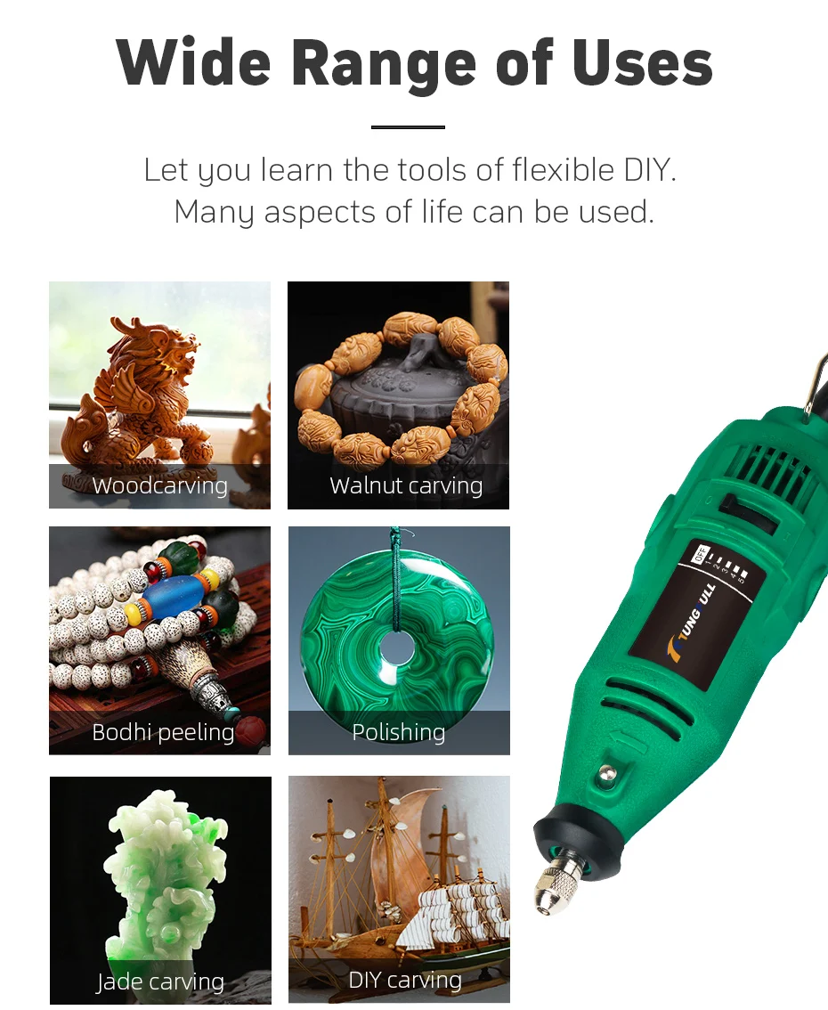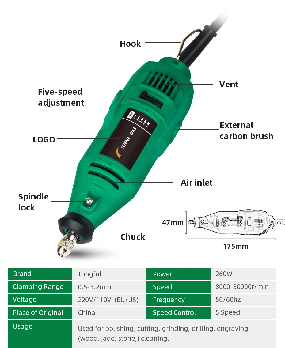 Цвет: зеленыйМесто оригинала: КитайНапряжение: 220 В, 110V.de ошибка мы посылаем 220 В, если вам нужно 110 В, пожалуйста, отметьте.Максимальная мощность: 260 ВтМашина для сбора Размеры: 0,5-3,2 ммПрименение: ewelry,home и wood makingФункция: для дерева, металла, керамики, пластика, полировки, шлифовки, резьбы, формирования и шлифования.