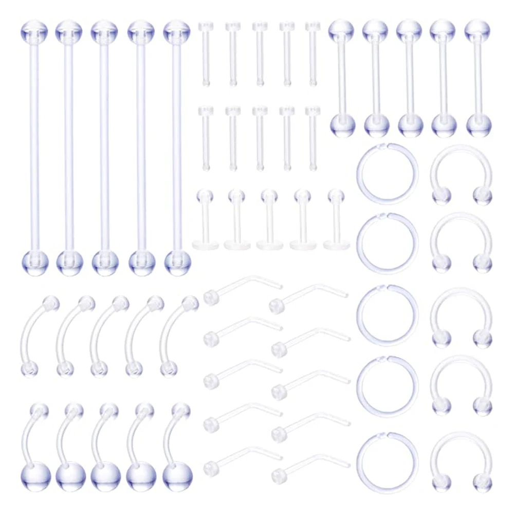 Один заказ включает в себя 5 прямых носовых колец, 5 l-образных носообразных колец, 5 прозрачных колец для языка, 5 прозрачных колец для губ, 5 прозрачных колец для бровей, 5 шт C Форма нос пирсинг фиксатор, 5 шт подковы кольцо для носа фиксатор, 5 шт Прозрачные кольца для живота