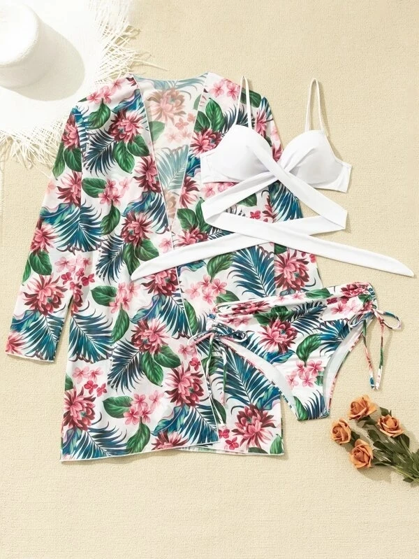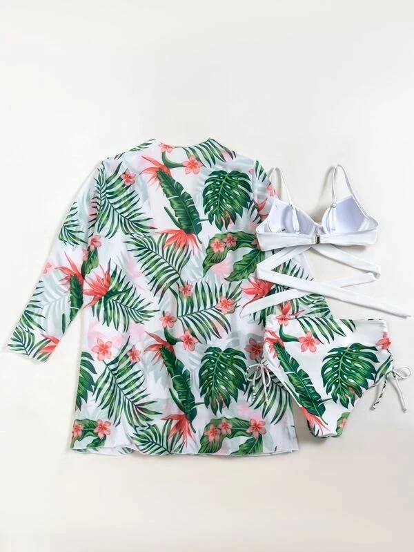 Купальник-бикини с цветочным и тропическим принтом, 3 предмета