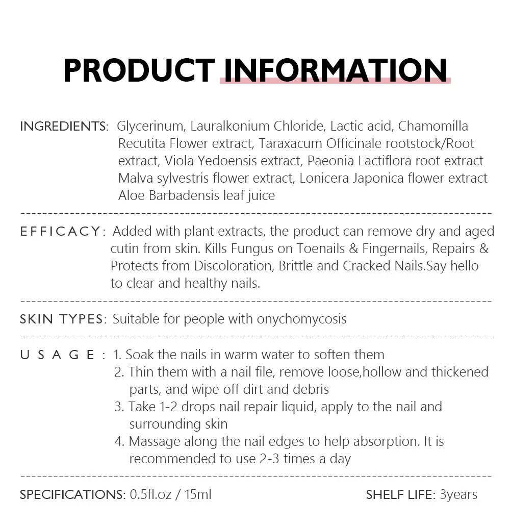 Добавленные растительными экстрактами, продукт может удалить сухую и состаренную кутин из кожи. Высокий уровень проникновения, так что вы можете легко достичь вокруг и под ногтями и лечения грибковой инфекции. Поздоровайтесь с чистыми и здоровыми ногтями.