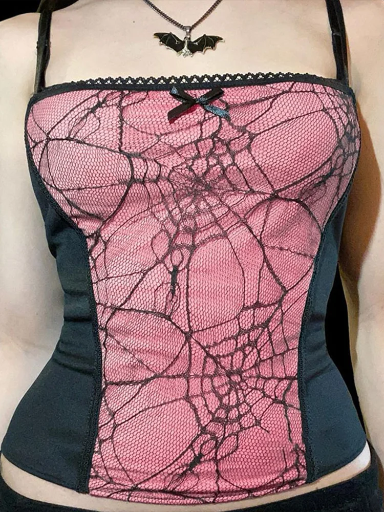 Винтажная сетчатая Розовая Майка InsGoth в стиле гранж, Облегающая майка с открытой спиной, летние базовые Топы в стиле пэчворк с бантом