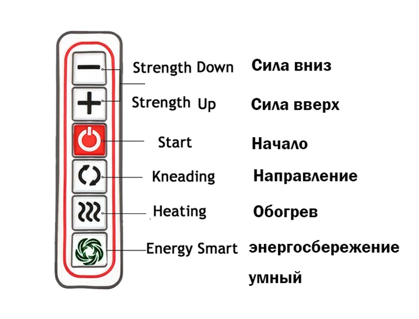 От вверх до вниз.1. Кнопка включения/выключения для запуска и закрытия массажера.2. Кнопка направления для переключения направления головки массажера. Вперед и назад3, кнопка скорости для изменения скорости головок массажа4. Кнопка нагрева для открытия или закрытия нагрева5, энергосберегающая кнопка для экономии электроэнергии6. Кнопка Smart mode автоматически изменяет направление и силу циклов.